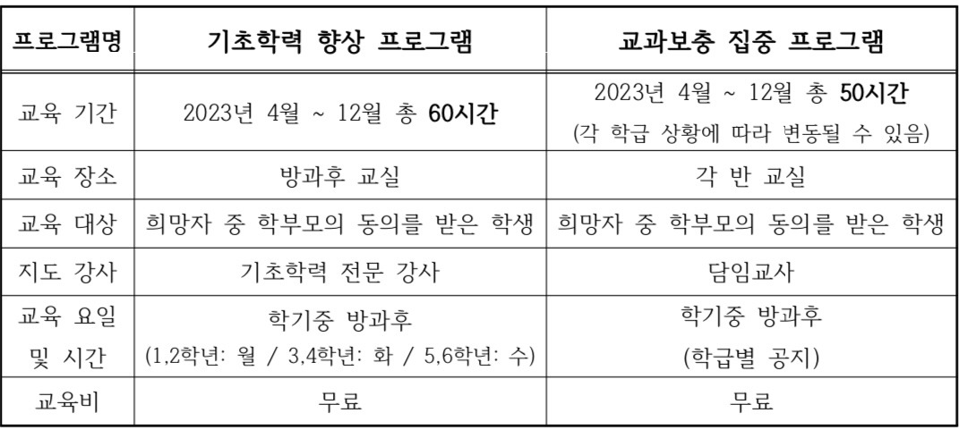 물론 한글을 잘 못 익히고 들어오는 친구들을 위해 학교에서도 프로그램이 있다. 점프업 프로그램, 기초학력 향상 프로그램, 교과 보충 집중 프로그램 등 이름은 조금씩 다르지만 교육 격차 해소와 맞춤형 교육을 위한 목적으로 만들어졌다고 한다. 전문강사나 담임선생님과 소수의 인원으로 무료로 진행되기 때문에 개인적인 생각으로는 잘 활용한다면 큰 도움을 받을 수 있을 것 같다.