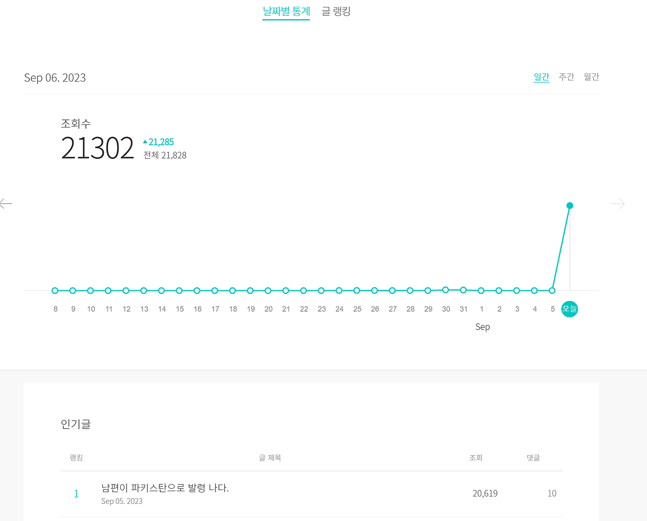 '남편 파키스탄 발령 나다' 글이 이틀동안 계속 다음 메인에 걸려 있었다. 지금 현재 9월8일(파키스탄시간 오전 6시 25분, 한국시간 오전 10시 25분)조회수 5만이 넘었다. 처음처럼 폭발적은 아니지만, 지금도 조금씩 늘고 있긴 하다. 처음에 조회수 1000이 넘었을때는 조회수 1000단위로 알림이 왔는데, 조회수가 만이 넘고 나니까 만 단위로 알림이 왔다. 그 사이에도 구독, 라이킷, 댓글 알림이 계속 왔었다. 그래서 기록으로 남겨놓으려고 한다. 참 감사한 일이다.^^