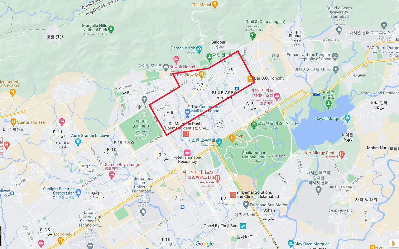 빨간색으로 표시해 놓은 지역인 F6, F7, F8, E7 : 파키스탄 수도에서 가장 부자 지역이자 외국인들이 많이 사는 곳