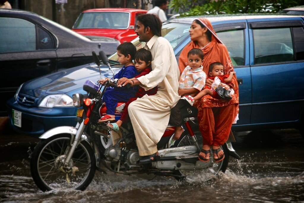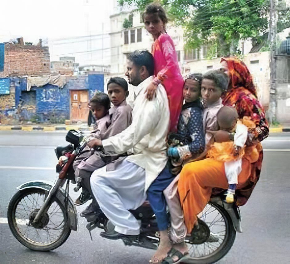 파키스탄 오토바이에 온 가족이 탄 모습. 가장 뒤에 탄 엄마가 간난아이를 한 팔로 안고 있다 (출처 : 구글 이미지)