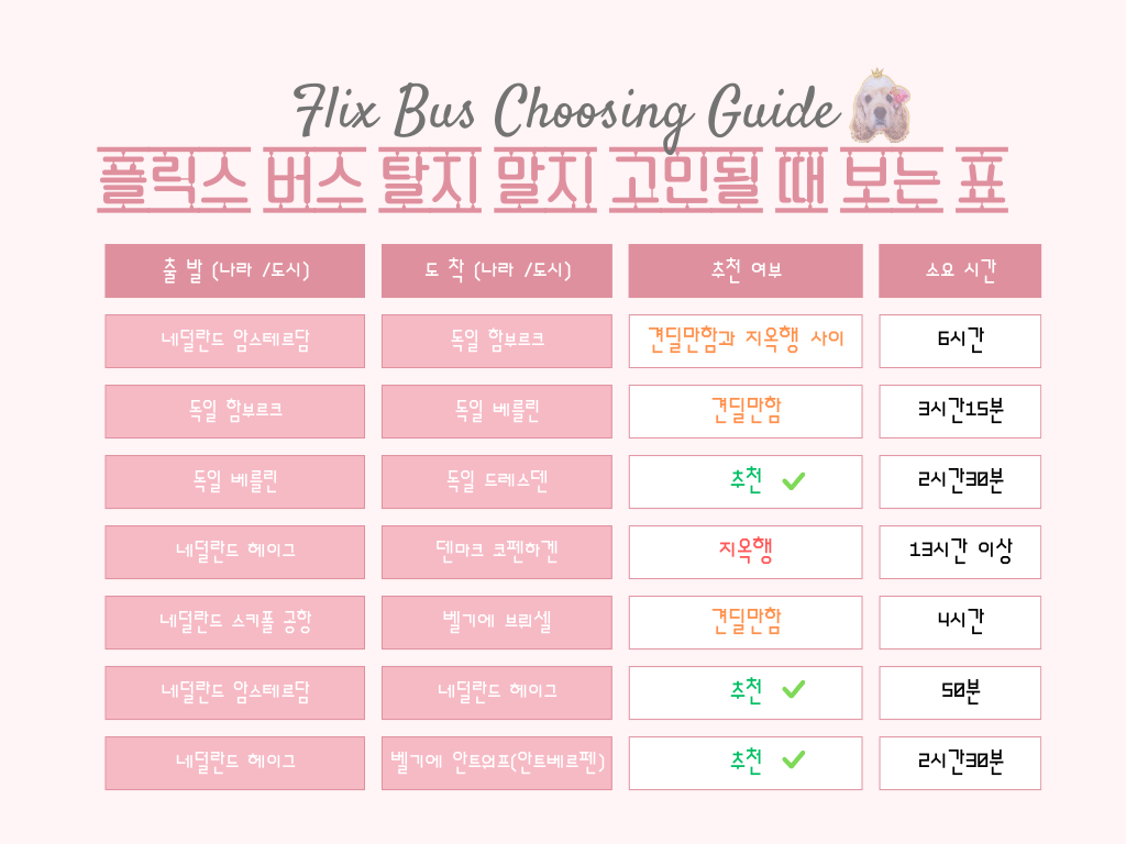 유럽 주요 도시나 나라 간 이동을 계획할 때 플릭스 버스 이용이 고민된다면 아래의 표를 참고하길 바란다.