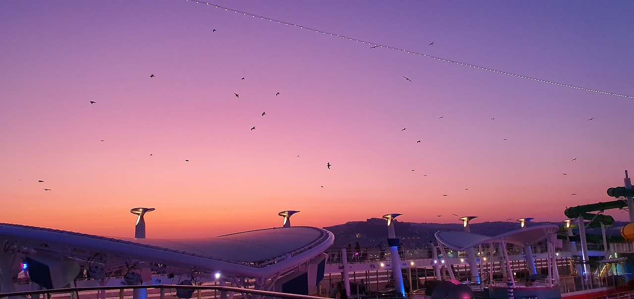 엄마와 함께한 이번 크루즈 여행의 깊은 여운이 전해지 듯, 나폴리를 떠나 기 전 선상에서 바라본 하늘은 특별했다. 연한 파스텔 무지갯빛 하늘은 점차 핑크색으로 물들었고 마침내 보라 물결의 석양으로 가득 찼다. 형언하기 힘들 정도로 아름다웠던 나폴리 하늘이 우리의 아쉬운 마음을 정성스레 어루어 만져 주었다.