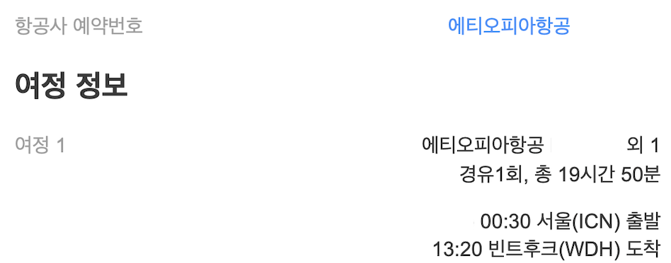 서울(ICN) - 아디스아바바(ADD), 에티오피아 - 빈트후크(WDH), 나미비아