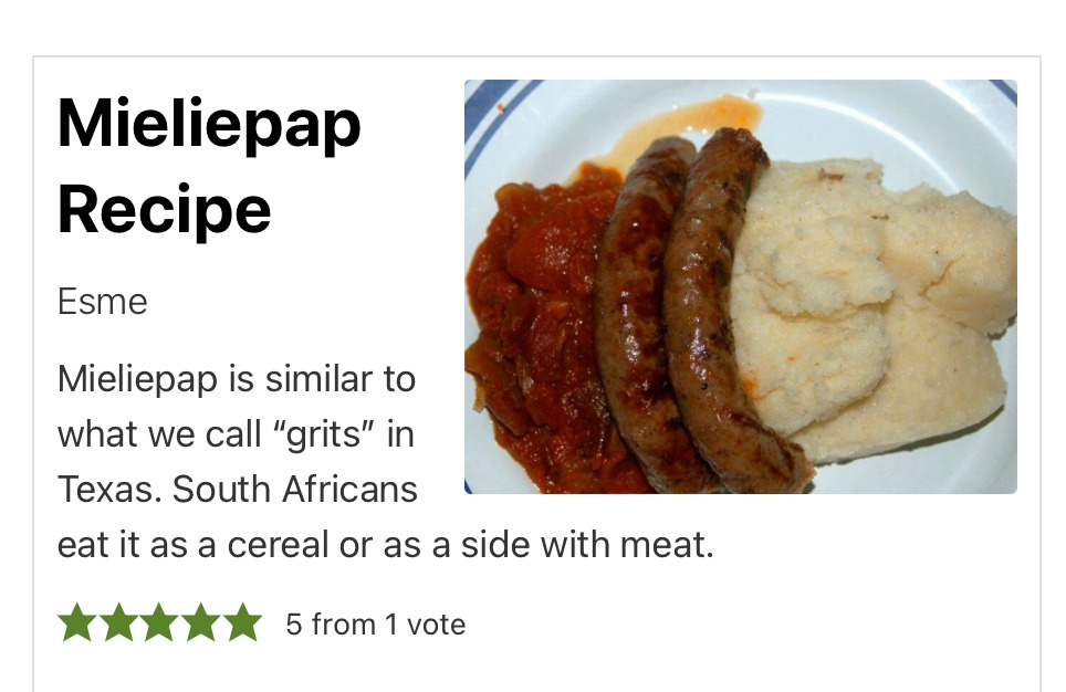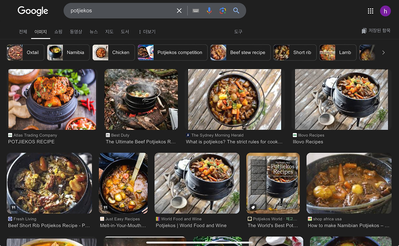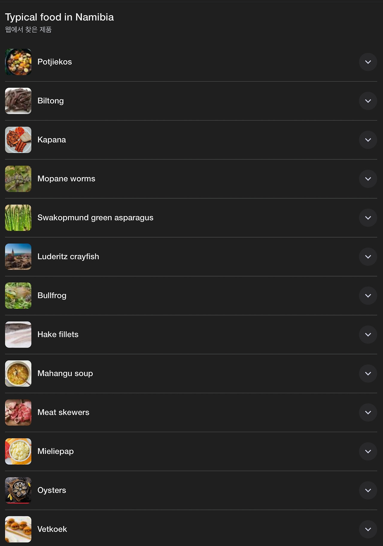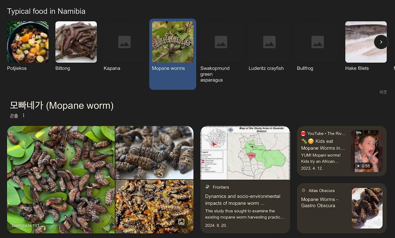 아무쪼록 이미 머릿속엔 나미비아의 맛집들을 떠올려보며 남들 다 가는 곳도 좋지만, 그곳에서만 경험할 수 있는 음식은 뭐가 있을까? 하는 생각으로 가득이다. 그래서 찾아보니 꽤나 재미난 검색결과들이 나왔다. 대략 열세가지 정도의 메뉴들이 구글 검색창을 블라인드 펼쳐지듯 나열이 되어있었다. 하나하나 눌러보며 어떤 음식인고 하고 찾아봤더니 우리가 흔히 먹는 음식과 비슷하면서도 다른 음식들이 꽤나 있었다.