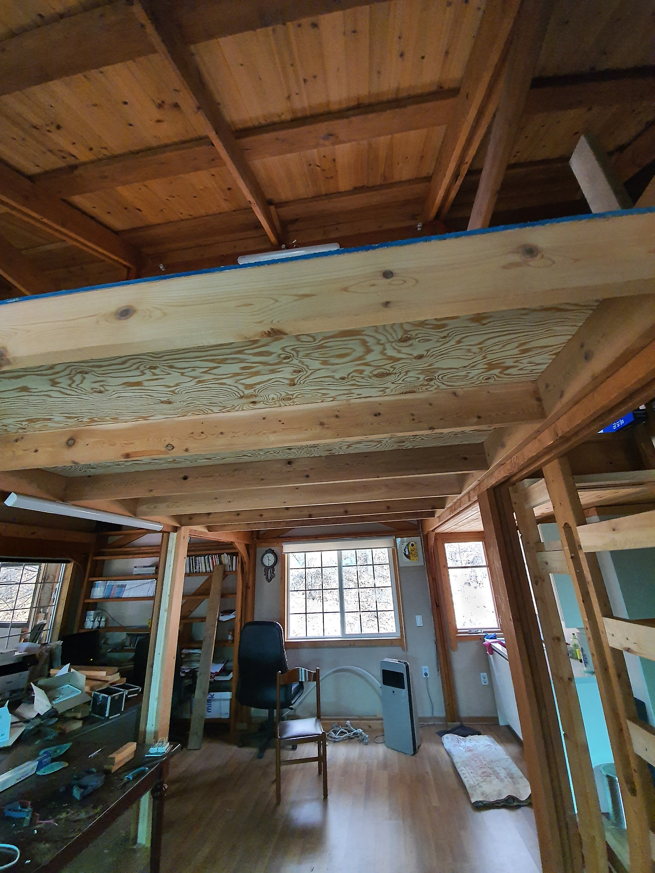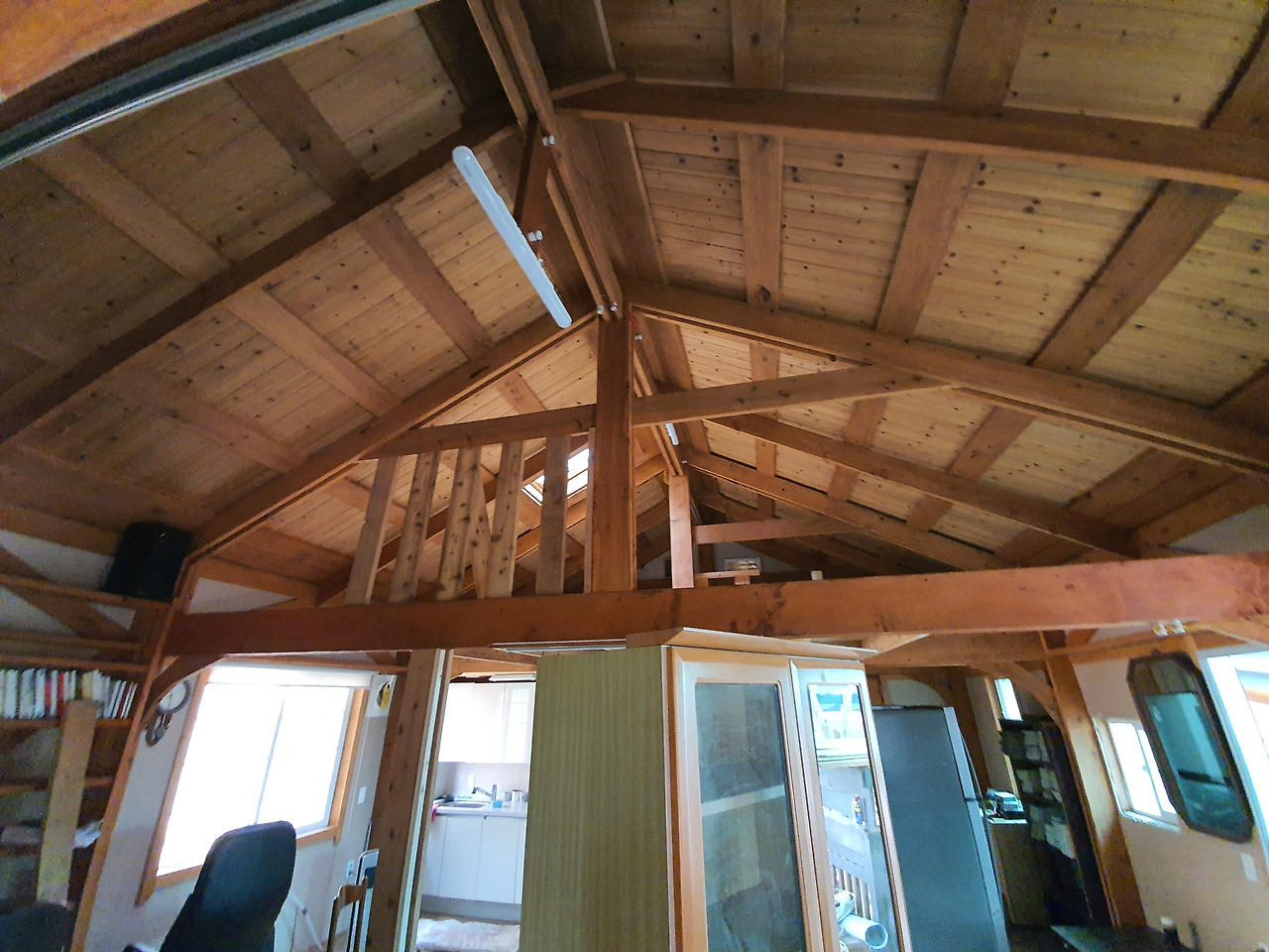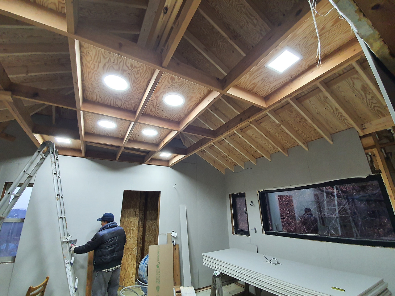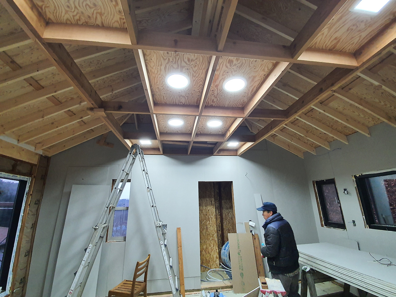 어느덧 내부 전기공사와 벽면 단열재 설치가 완료됐다. 천장이 높다. 그래서 시원시원하다. 간접조명을 설치했다. 벌써부터 은은한 분위기다. 침실로 활용할 수 있는 복층도 만들었다. 민박을 목적으로 하다보니 떠오른 구상이다.