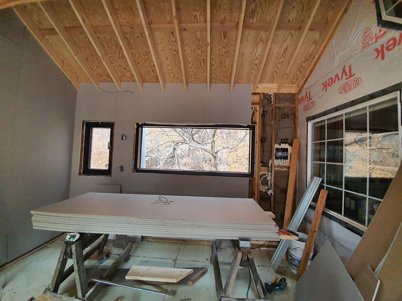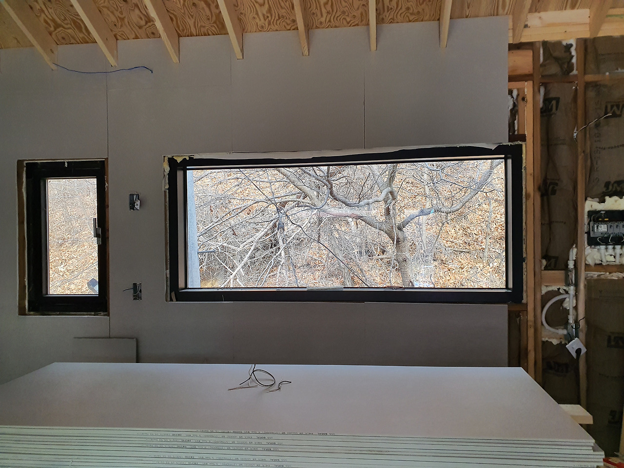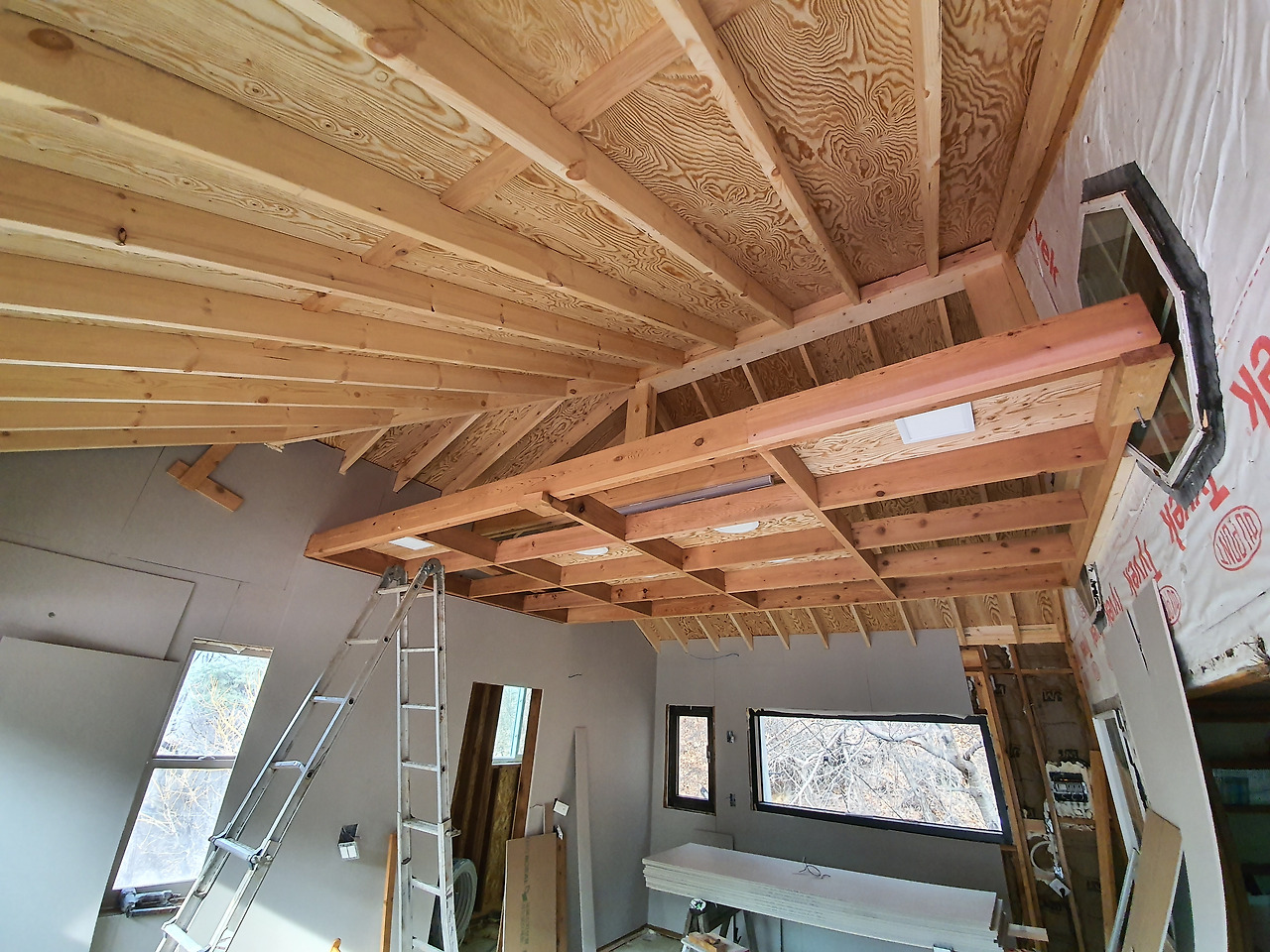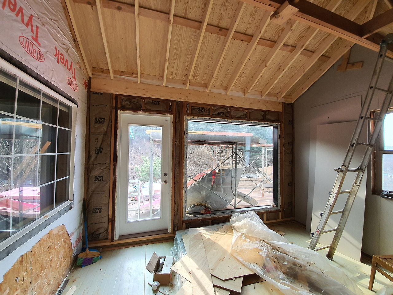 어느덧 내부 전기공사와 벽면 단열재 설치가 완료됐다. 천장이 높다. 그래서 시원시원하다. 간접조명을 설치했다. 벌써부터 은은한 분위기다. 침실로 활용할 수 있는 복층도 만들었다. 민박을 목적으로 하다보니 떠오른 구상이다.