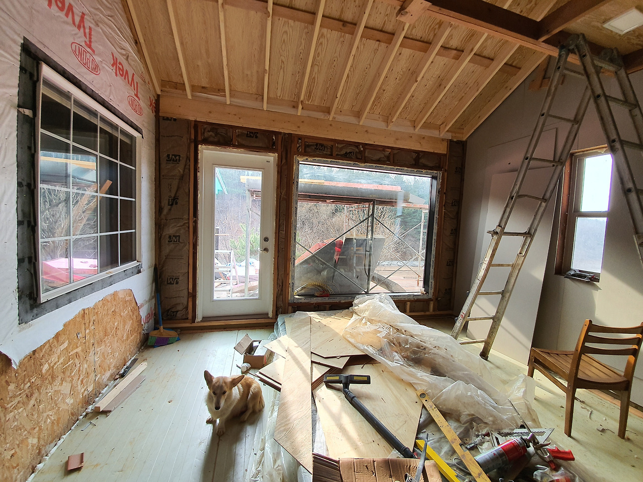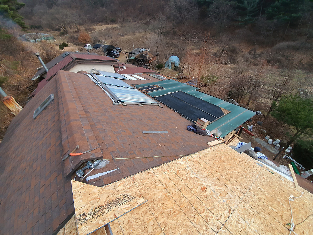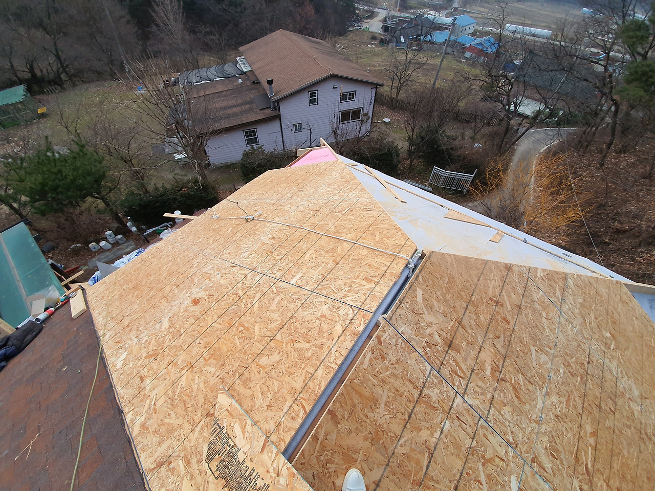 단열과 합판 부착을 위해 지붕위에 올라갔다. 높은 곳에 겁이 많은 탓에 온몸에 힘이 바짝 들어간다. 작업용 밧줄에 의지해 지붕 위를 누비며 아버지와 우정을 쌓았다.