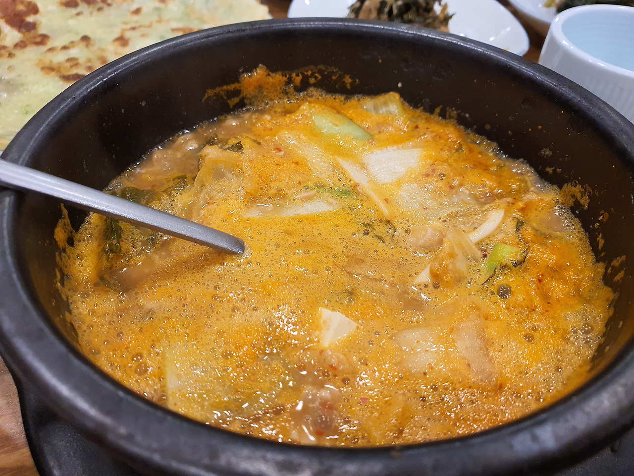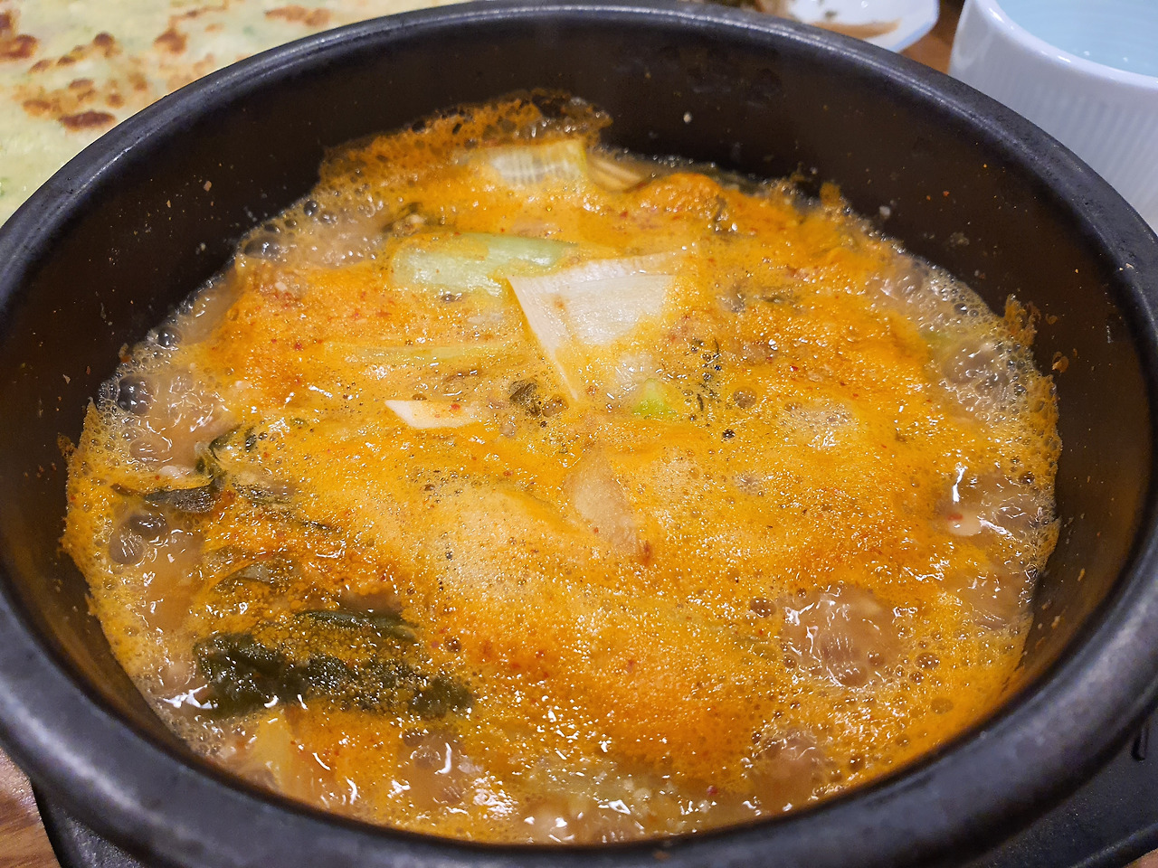 과하게 진하지 않다. 국물은 청국장 하면 떠오르는 그것보다 조그 더 맑다. 된장찌개와 청국장의 중간 수준. 약간운 심심하게 느껴지지만 과하지 않아서 좋다.