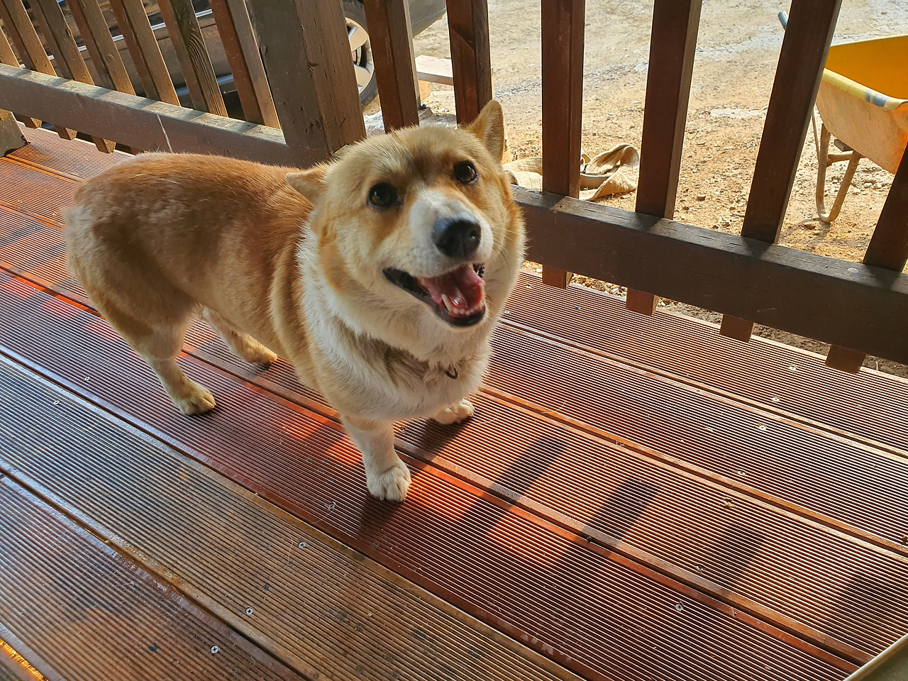 늠름한 깐식이, 새로 오픈한 몽실이네민박 테라스를 지키고 있다. 손님이 오나 보초를 서는지...