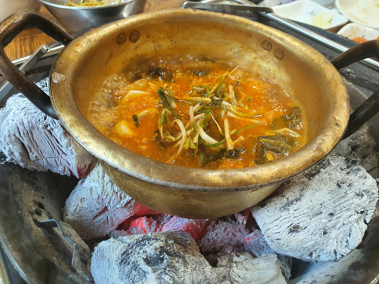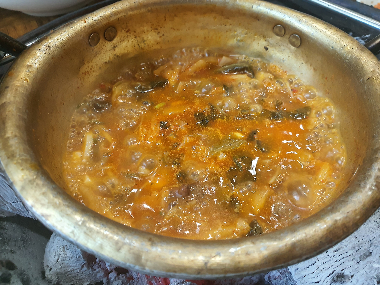 불빼고 그냥 숯불위에 양푼냄비를 얹으면 순식간에 찌개가 끓는다. 내용물을 가위로 잘게 썰어준다. 곱창전골과 비슷한 느낌도 나면서 다른것에서 겪어보지못한 별미가 완성된다.