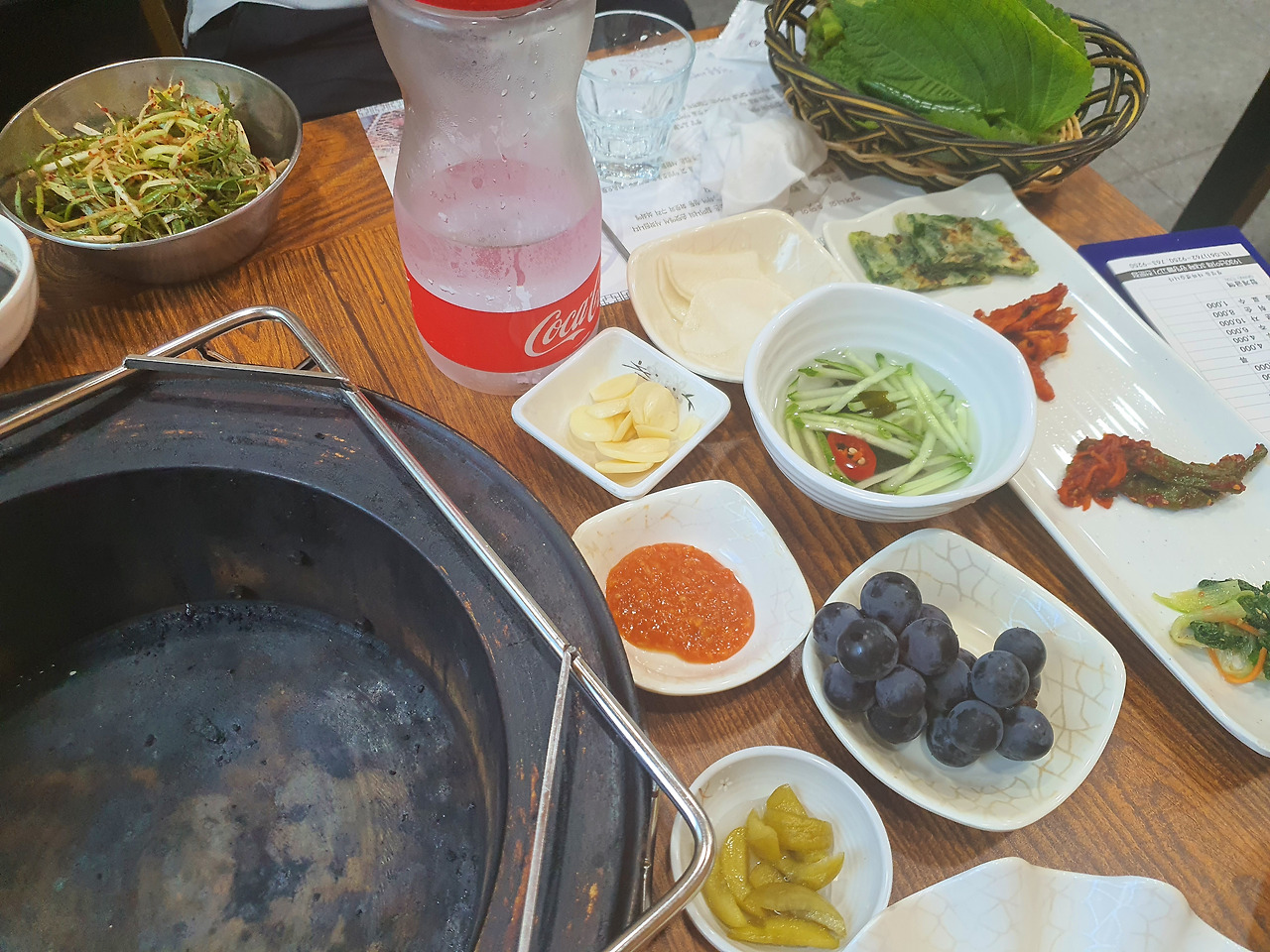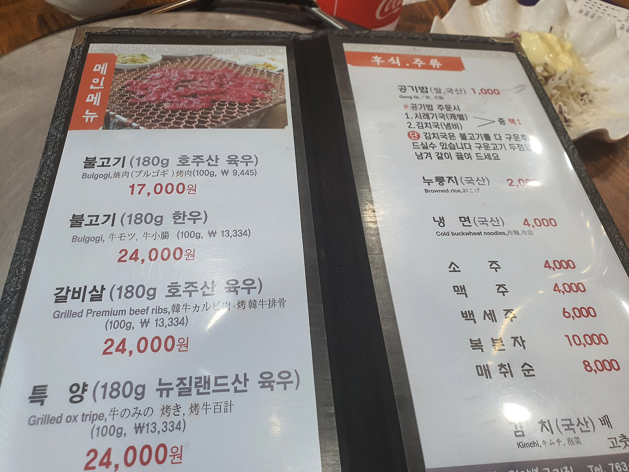 간판에서부터 포스가 느껴진다. 평일 낮에도 보통 대기번호를 받아야 한다는데, 요즘엔 코로나로 손님이 줄었다고 한다. 메뉴는 심플하다. 한우 불고기 3인분과 호주산 1인분, 잎새주를 주문했다.