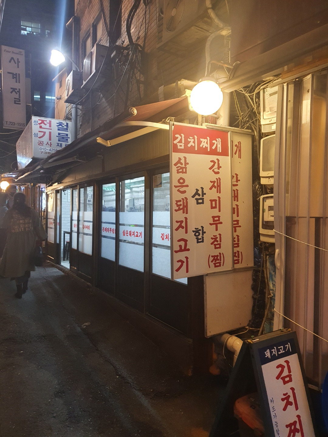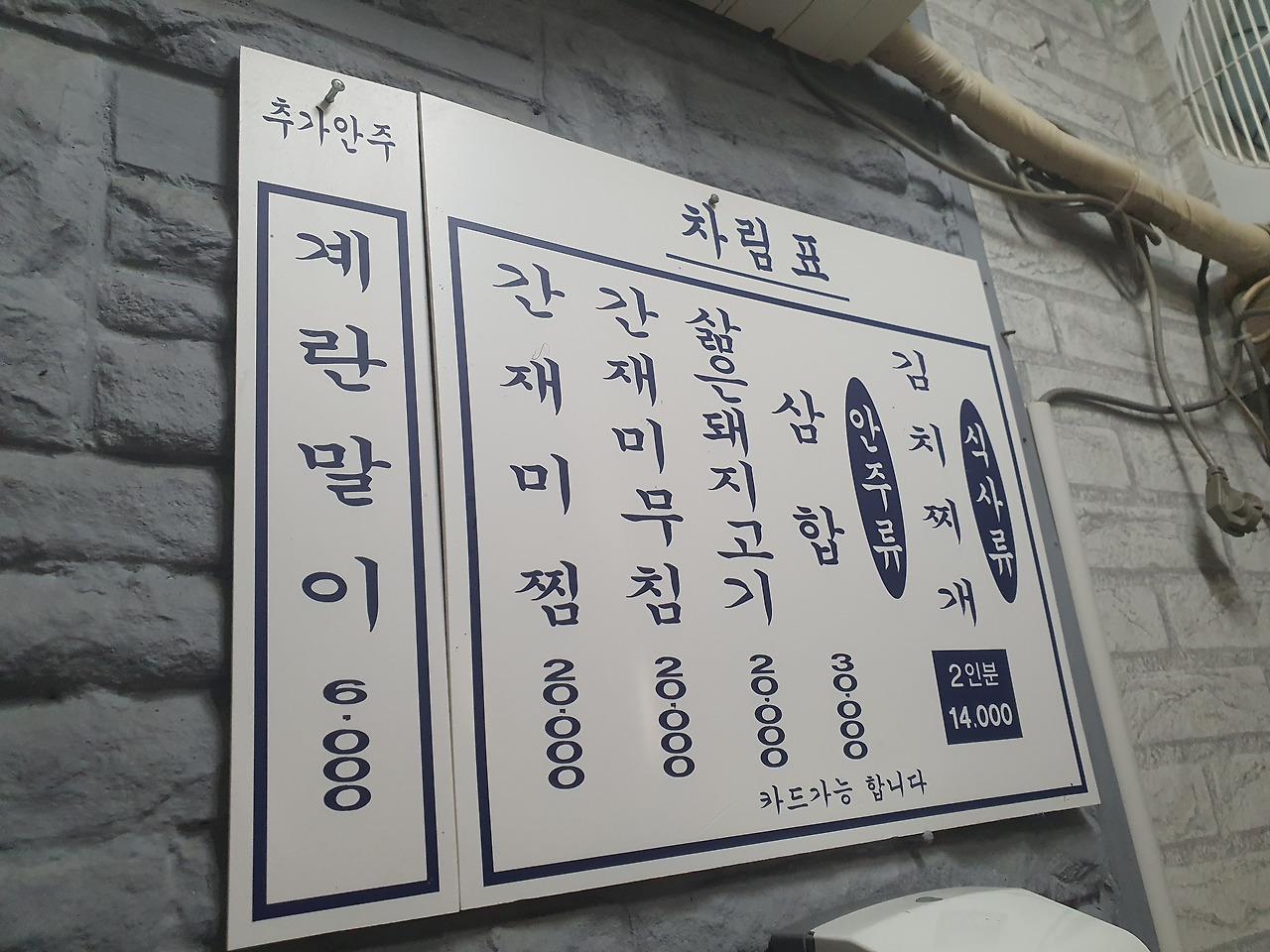 정겨운 간판이 있는 입구, 메뉴는 심플하다. 김치찌개, 삶은돼지고기, 삼합, 간재미무침, 찜도 가능하다. 계란말이까지. 삼합을 제외한 모든 메뉴를 주문했다.
