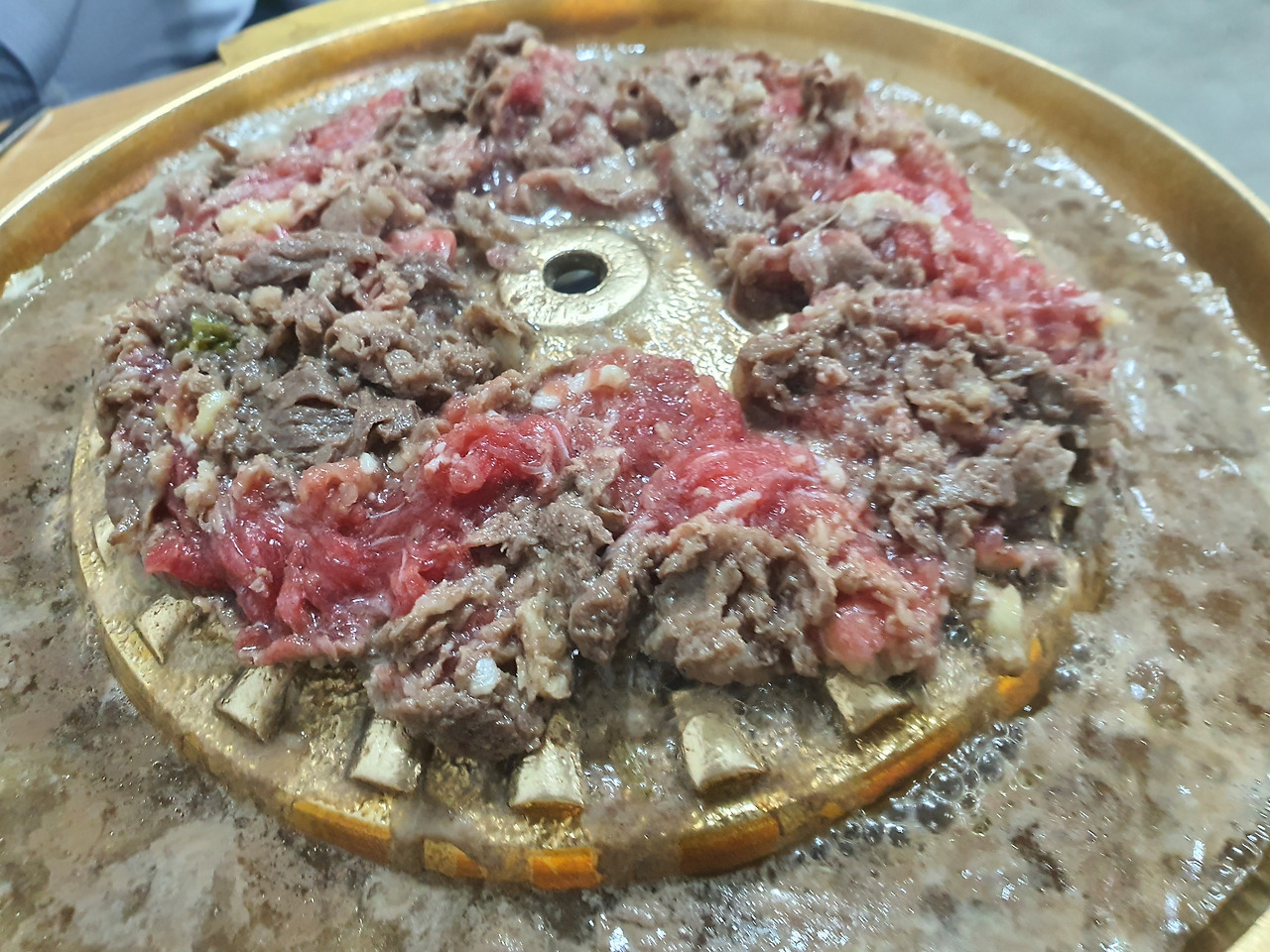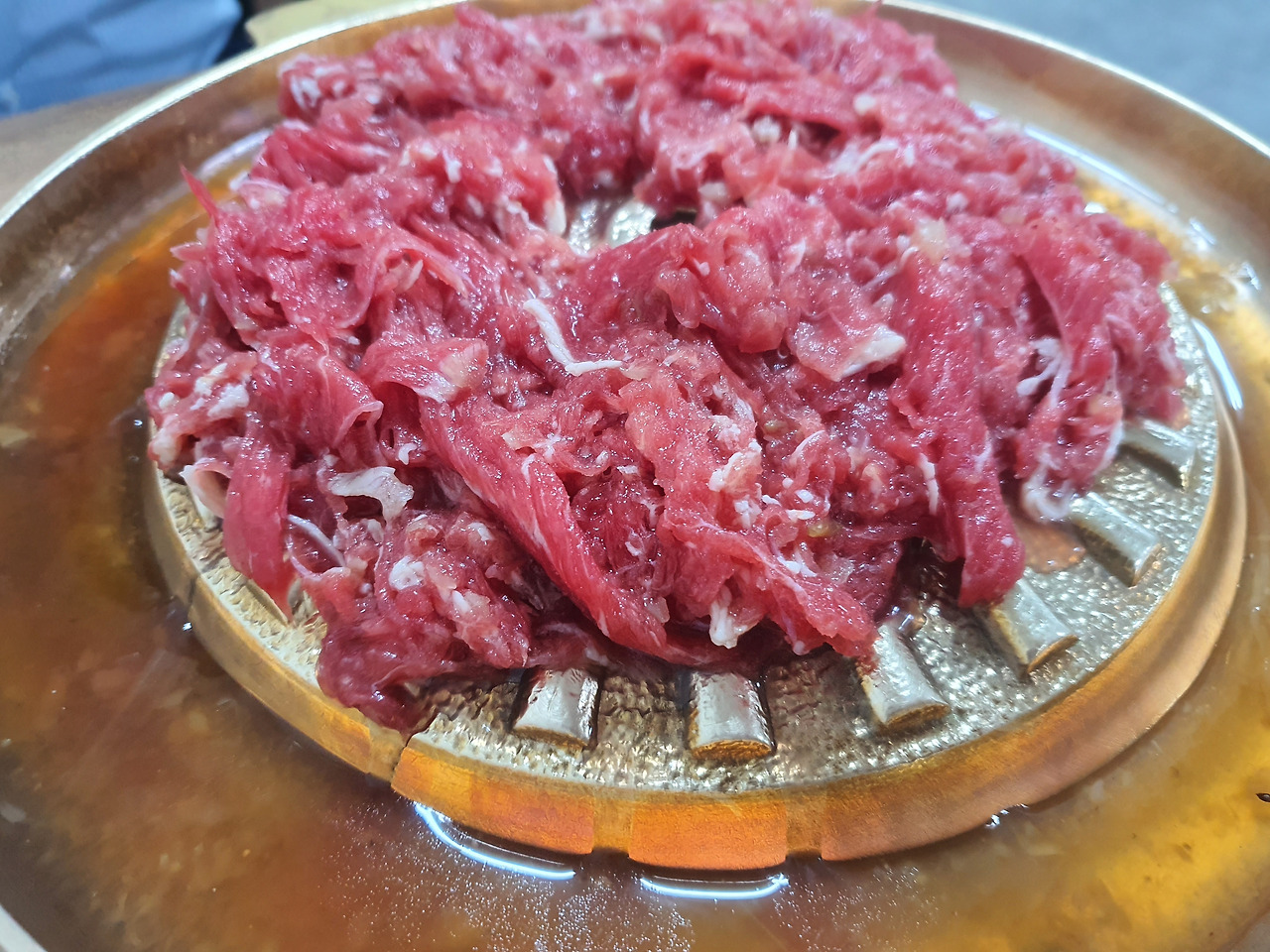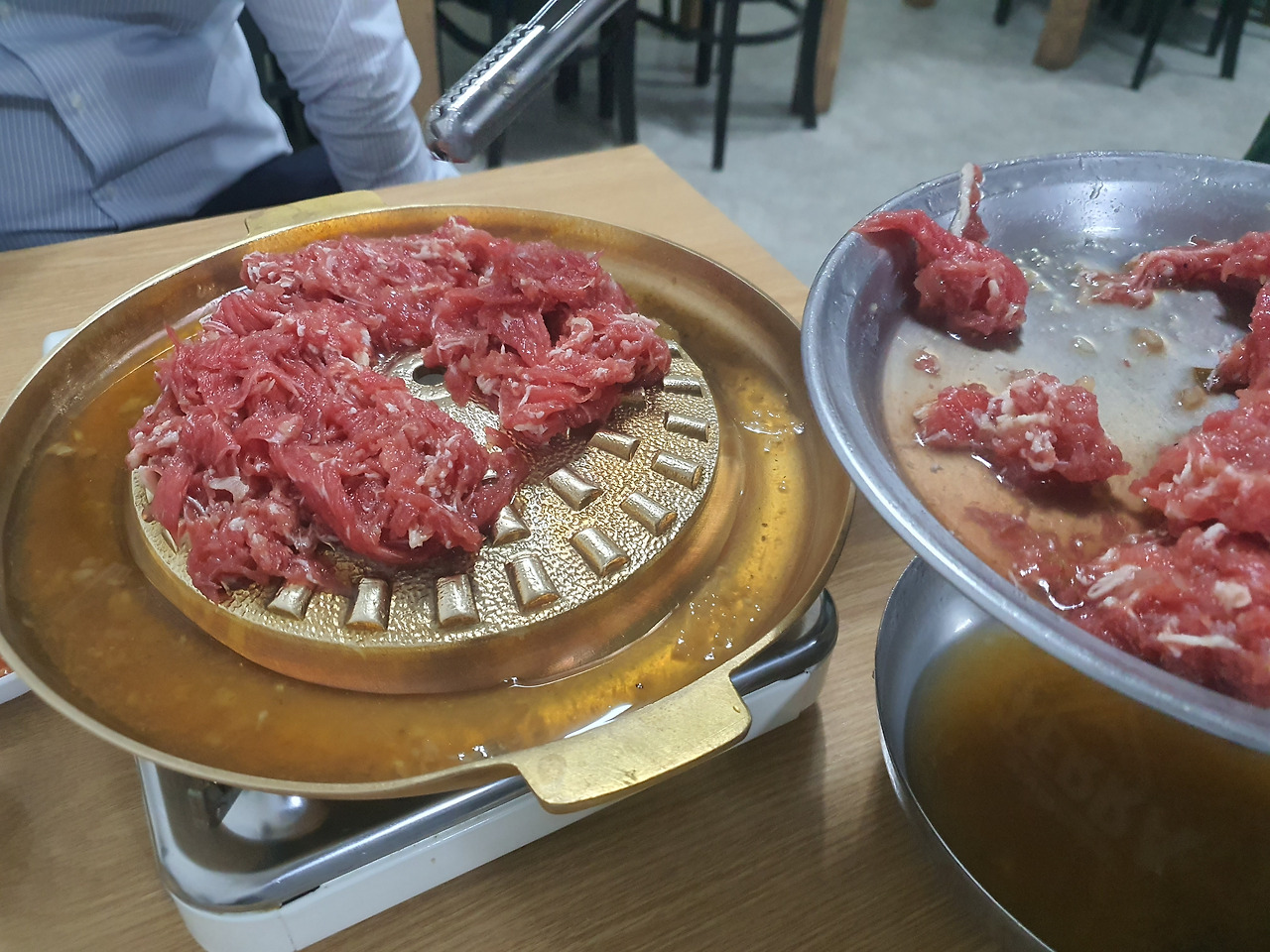 불고기 등판. 9월 휴가 때 광양에서 광양불고기를 먹고 왔는데 스타일은 약간 다르다. 광양불고기는 숯불에 석쇠로 굽는데, 여긴 가스불이다. 2인분인데 양이 기대 이상으로 많았다. 두 판이 나온다.
