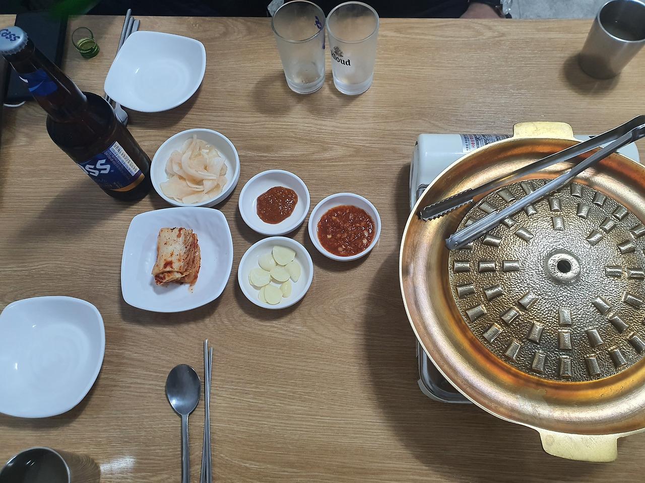 다행히 자리는 많았다. 본관엔 사람이 많아서 별관으로 갔다. 나올때쯤 되니 여기도 꽉찼다. 인테리어는 동남아 한식당 느낌이다. 조립식 건물, 인테리어랄게 따로 없다. 심플 그 자체. 맛 하나만으로 승부한다는 얘기다. 구리색 불고기용 식기가 심상찮다. 일단 소맥으로 혀와 위를 예열시켰다.