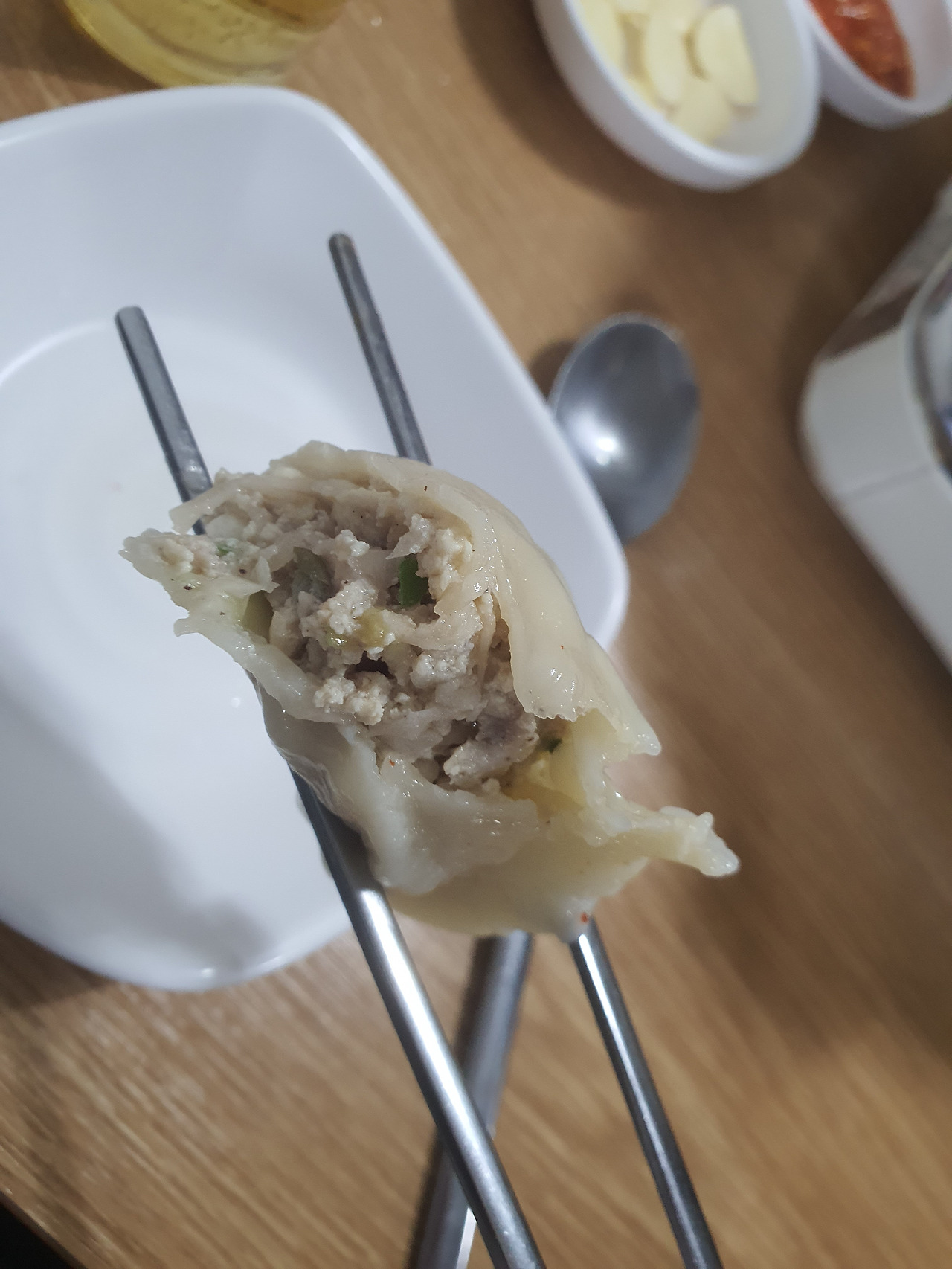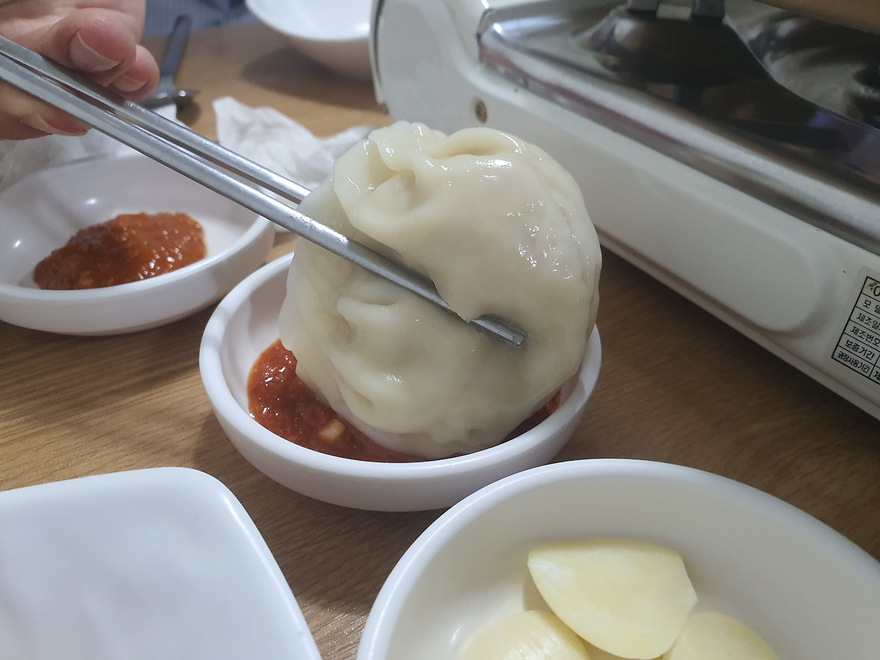 특제소스. 쌈장말고 비슷한 비쥬얼의 특제소슨데 별미다. 만두는 속도 꽉꽉 찼다. 아삭아삭한 식감이 좋다. 30개도 먹을 수 있을 것 같다. 간절한 상황이라면 50개도 가능할듯.