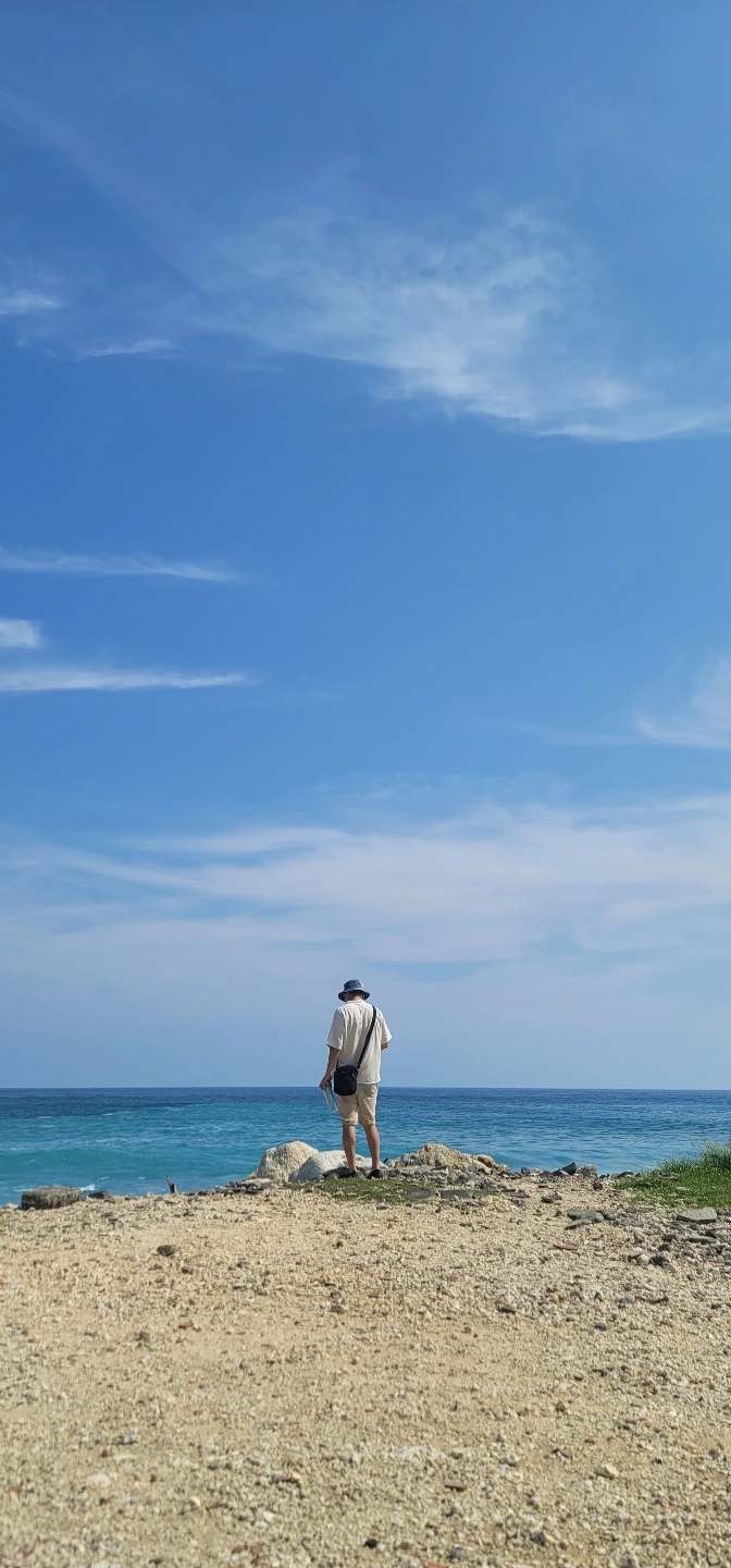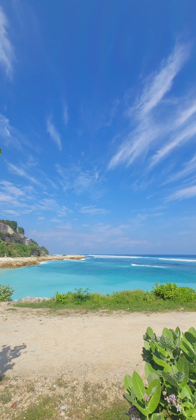 깎아지른 절벽이 해변 입구를 감싸고 있었다. 비포장 도로를 몇분쯤 지나자 입이 딱 벌어지는 장면이 나타났다. 몰디브 바다 하면 생각나는 그 색, 채도높은 하늘색 정도로 표현할 수 있는 비취색부터 시작하는 데코레이션이 펼쳐진다.