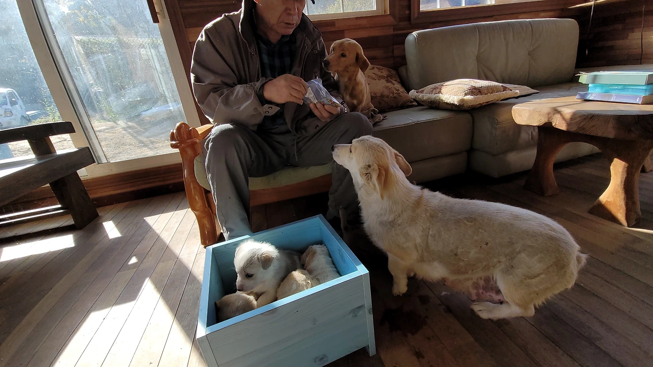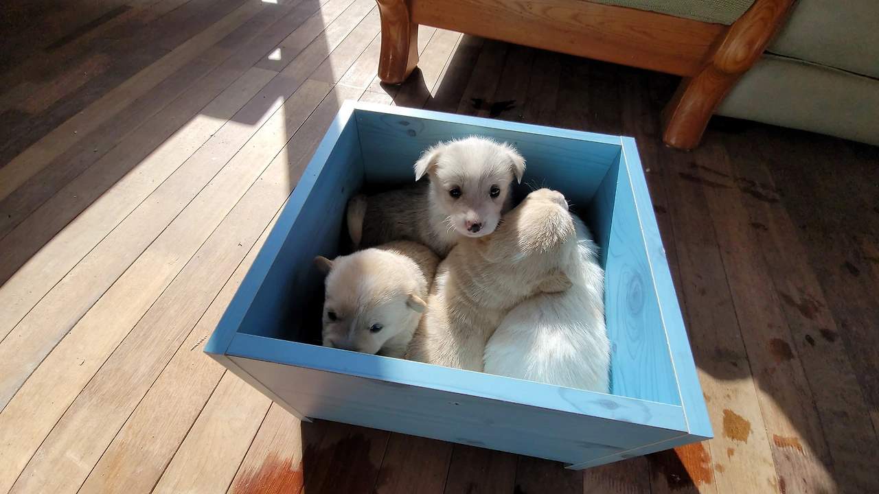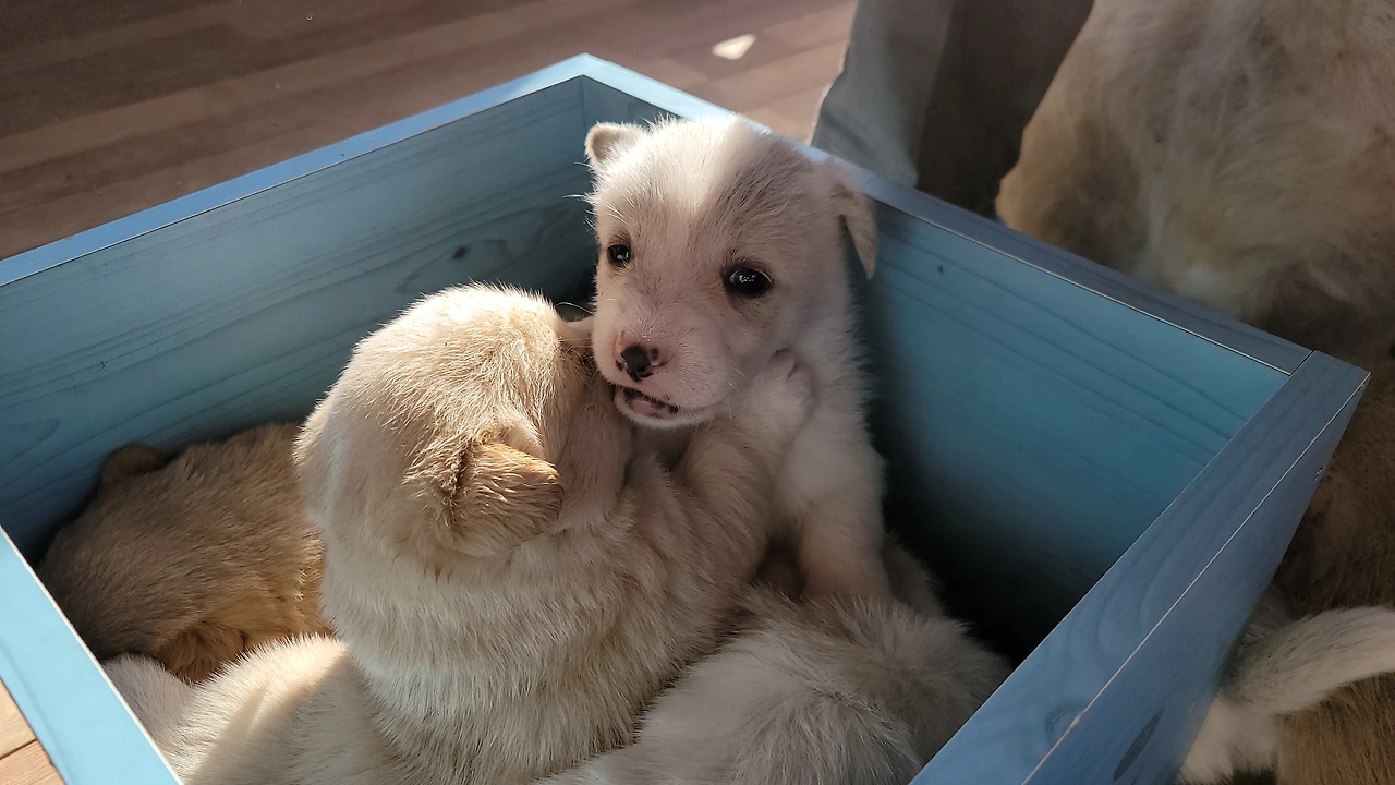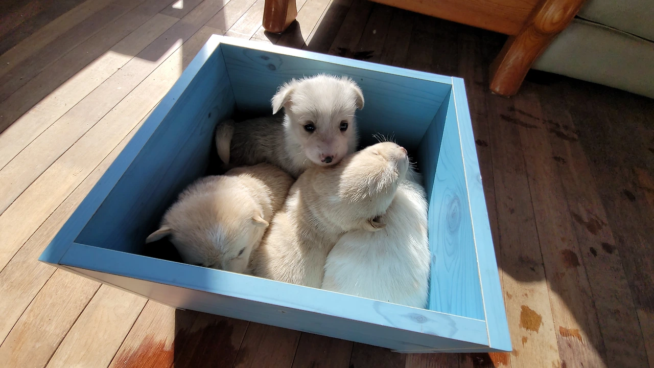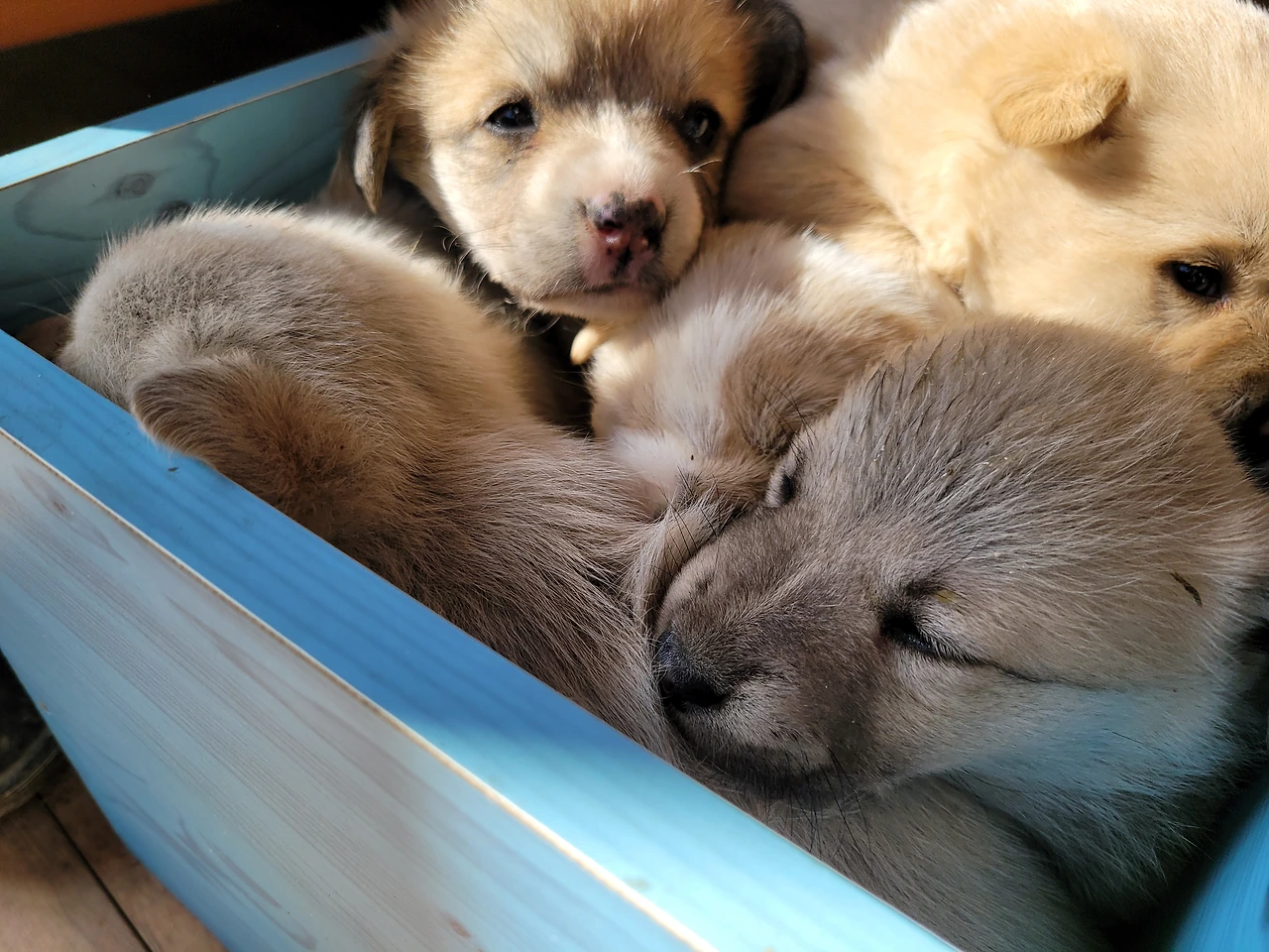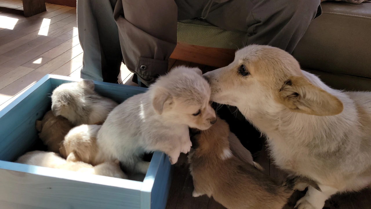 태어난지 한 달이 안된 웰시코기 계열 시고르자브종 7형제. 깐순이네 4형제와 몽실이네 3형제 공동육아를 시작했다