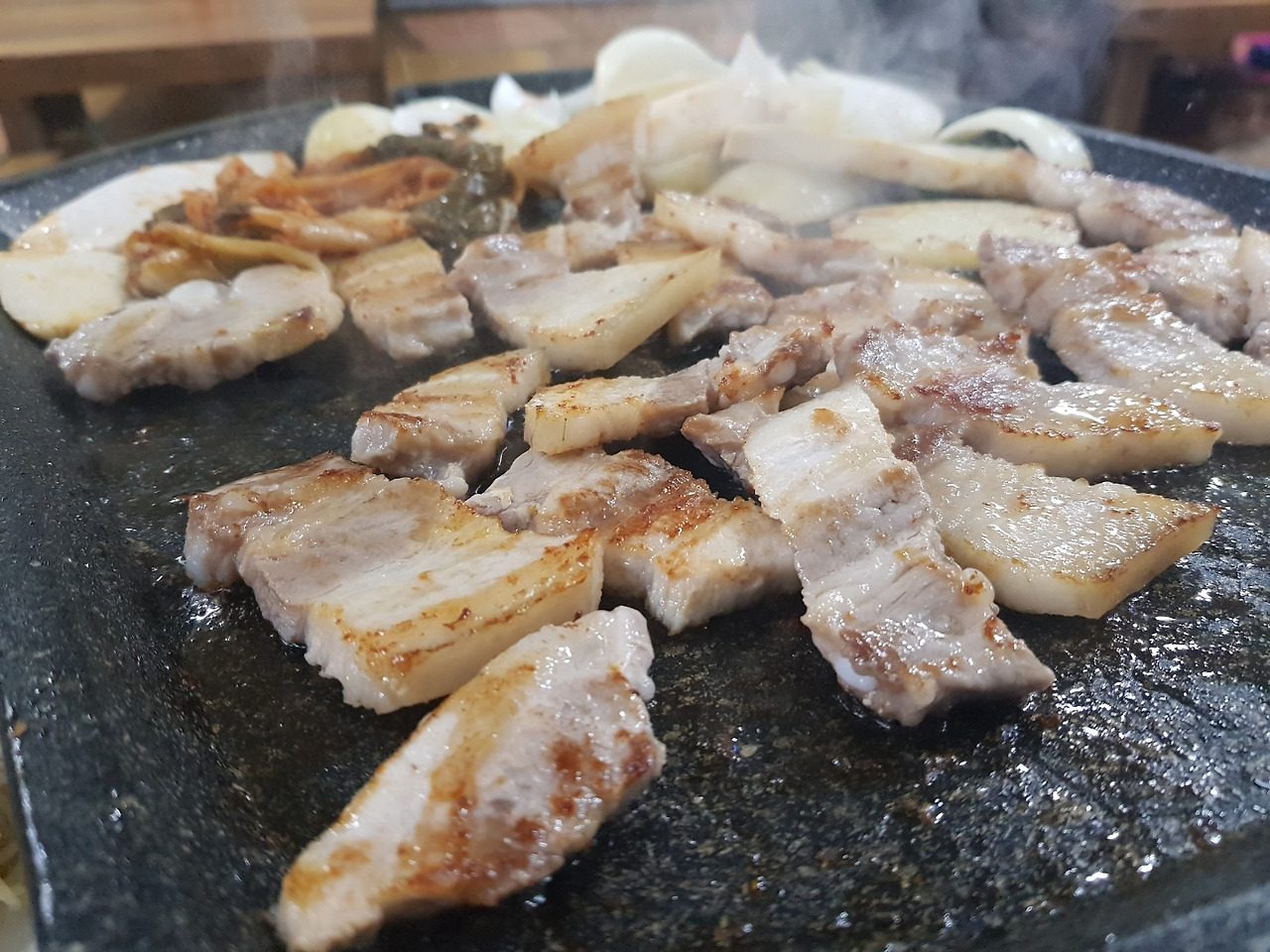 명문식당에서 가장 즐기는 메뉴는 삼겹살이다. 1인분에 12000원인데, 다른 집 기준 1.5인분 정도 되는 것 같다. 고기를 맨 끝에 놓고, 기름이 자연스레 흐르게 해 양파와 감자를 굽는다. 구운 감자는 생각만해도 군침이 돈다.
