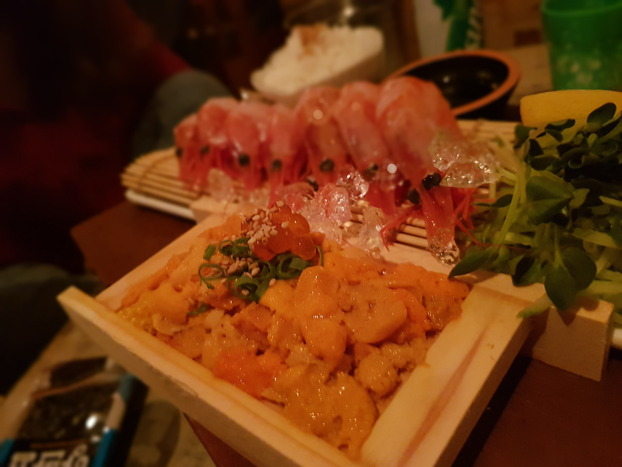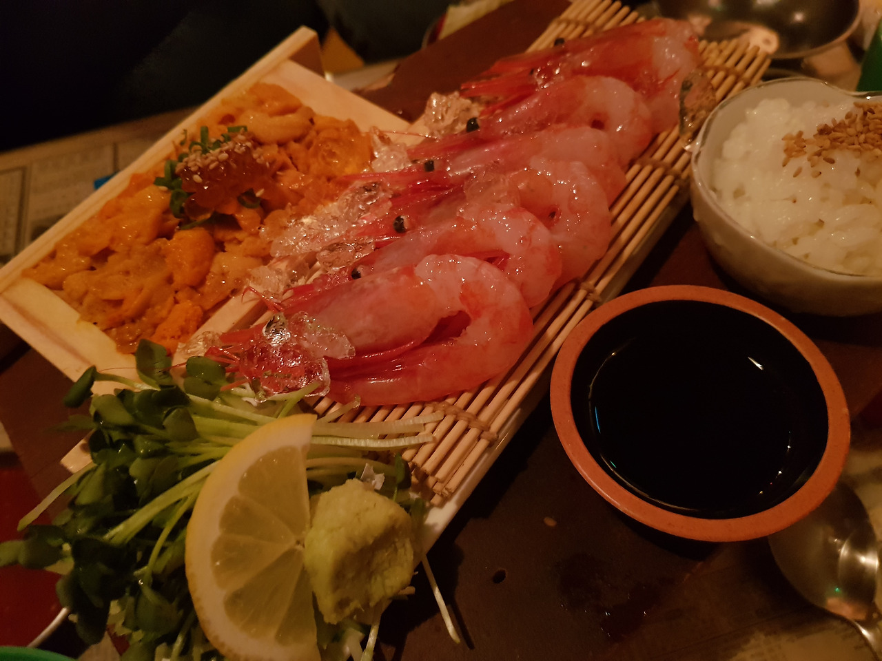 늦은 시각이라 회 메뉴는 매진됐다. 또 다시 장고끝에 우니+김단새우 세트를 주문했다. 큰 기대는 없었는데, 기대를 했더라도 그 이상이었을 퀄리티의 우니가 나왔다. 일단 신선하다. 비리지 않다. 특유의 고소함은 생와사비를 만나 배가 된다.