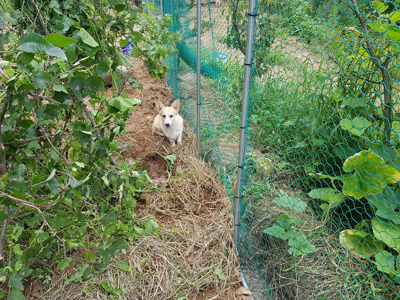 긴 파이프로 기둥을 세우고, 망으로 기둥을 둘렀다. 40평은 되는 넉넉한 공간이 만들어졌다. 나중에 닭들이 쉴 횃대와 그늘이 돼줄 나무들을 심었다.