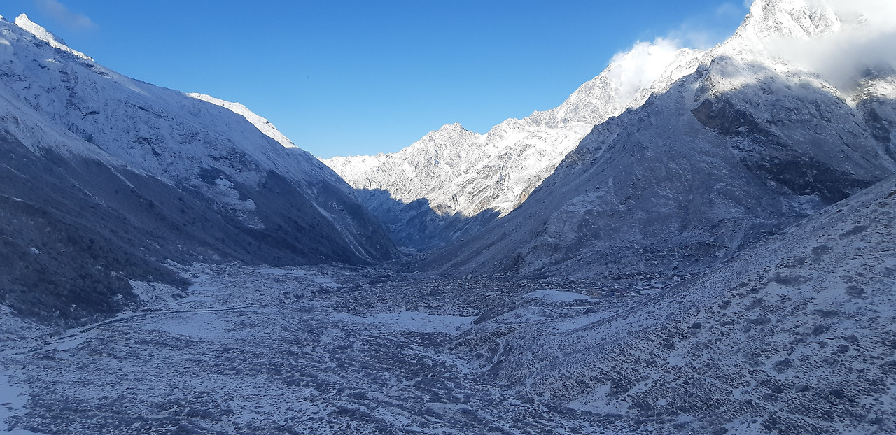 날이 험하면 탕샵(3,200m)에서 하룻밤 머무르려던 생각을 고쳐 다시 원래의 계획대로 랑탕 마을(3,430m)까지 가기로 했다. 오늘 눈길에서 좀 수고하면 내일 점심때쯤 강진 곰파(3,860m)에 도착할 것이다. 그러면 오후 한나절을 벌 수 있다. 눈발은 그쳤고 올라가면서 신기하게도 눈이 쌓인 곳이 점차 줄어들기 시작했다. 여기는 눈도 높이에 따라 국지적으로 오는 건가. 신비한 일의 연속이다.