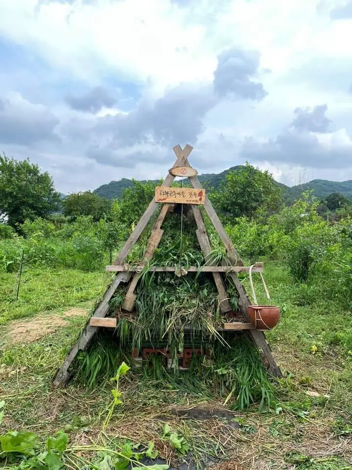 농사를 잘 아는 사람 없이 삼 년째 농사를 짓다가 ‘퍼머컬처 디자인 코스’를 열어 한 달에 한 번씩 새로운 농사법을 온종일 배웠다. ‘1+1=1’이라는 평화마을의 가치를 표현하는 밭 디자인을 하고, 가운데 동그란 동산에 갖가지 허브를 심으니 나비와 벌에 이어 새들이 날아와 노닐었다. 밭두둑을 30㎝ 이상 높이 올려 물을 거의 주지 않고, 고랑을 넓게 하되 풀이 나지 말라고 신문지-상자-폐펼침막-제초매트-발효 볏짚으로 다섯 겹 멀칭(덮기)을 했다. 천지은·동포은에 보은 하는 마음으로 화학비료와 제초제는 물론 비닐도 쓰지 않고, 커피 찌꺼기와 발효 볏짚을 덮어 다양한 작물과 꽃들이 어울려 자라게 했다.