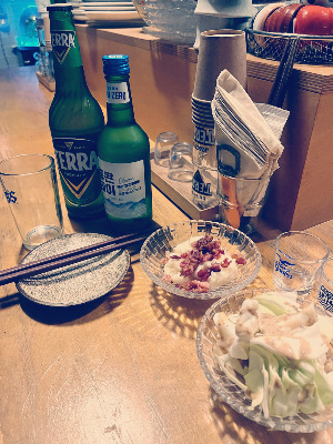 곱고 다정한 목소리로 ‘사장님 저희 켈리하나랑 좋은데이하나요.’ 독백 이후 음식이 세팅되기 전 도착한 두병의 술과 4개의 잔. 원샷의 비율로 가볍게 소맥을 만든다. 마주한 이에게 잔을 건네고 내 몫의 잔을 들어 보이면 같은 모습으로 잔들 들어 보이고 들이킨다. 우린 데칼코마니다. 잔을 내려놓으면 짧은 묵언수행은 종료된다. 이제부터가 대화의 시작이요 식사의 시작이다.