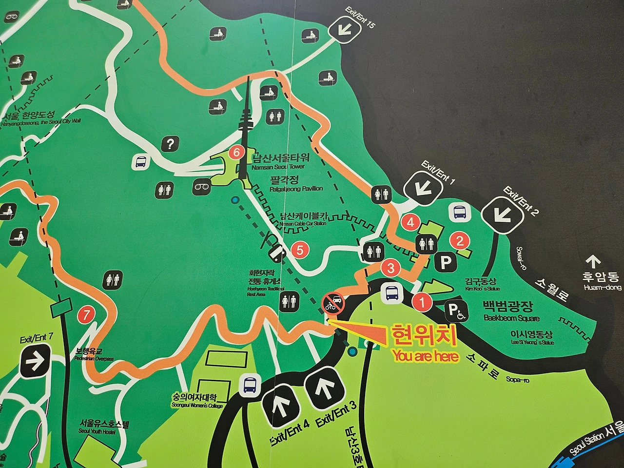 화장실은, 계단을 올라 남산타워로 올라가는 길목에 있다.
