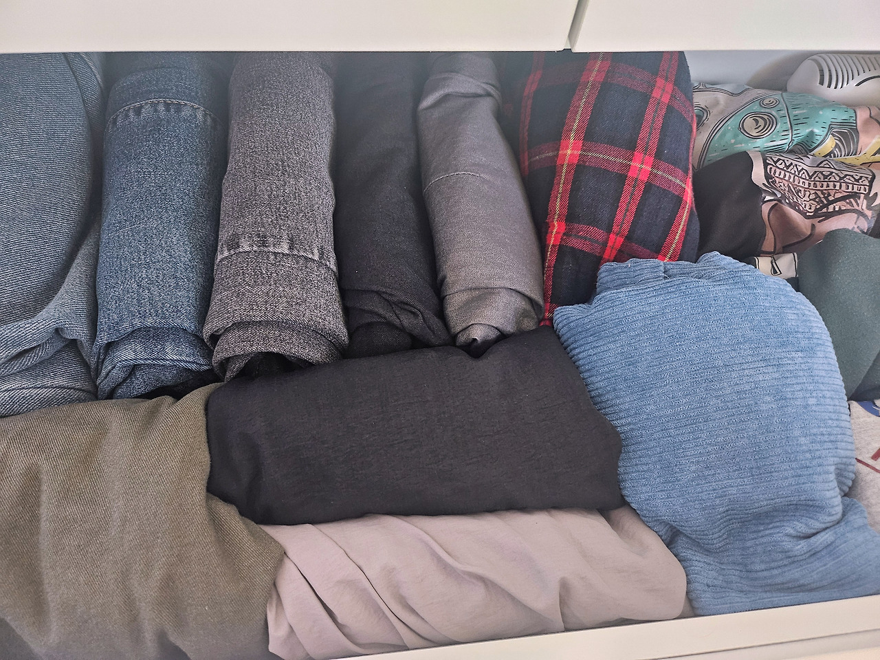 사진 속 옷장 서랍에는 사계절 바지가 다 들어 있다.