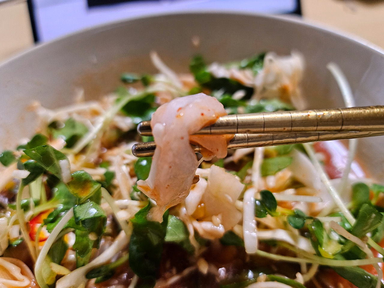 나는 여기에 초고추장을 추가로 만들어 넣고 차가운 냉면 육수와 깨, 참기름을 넣고 섞어 버렸다.