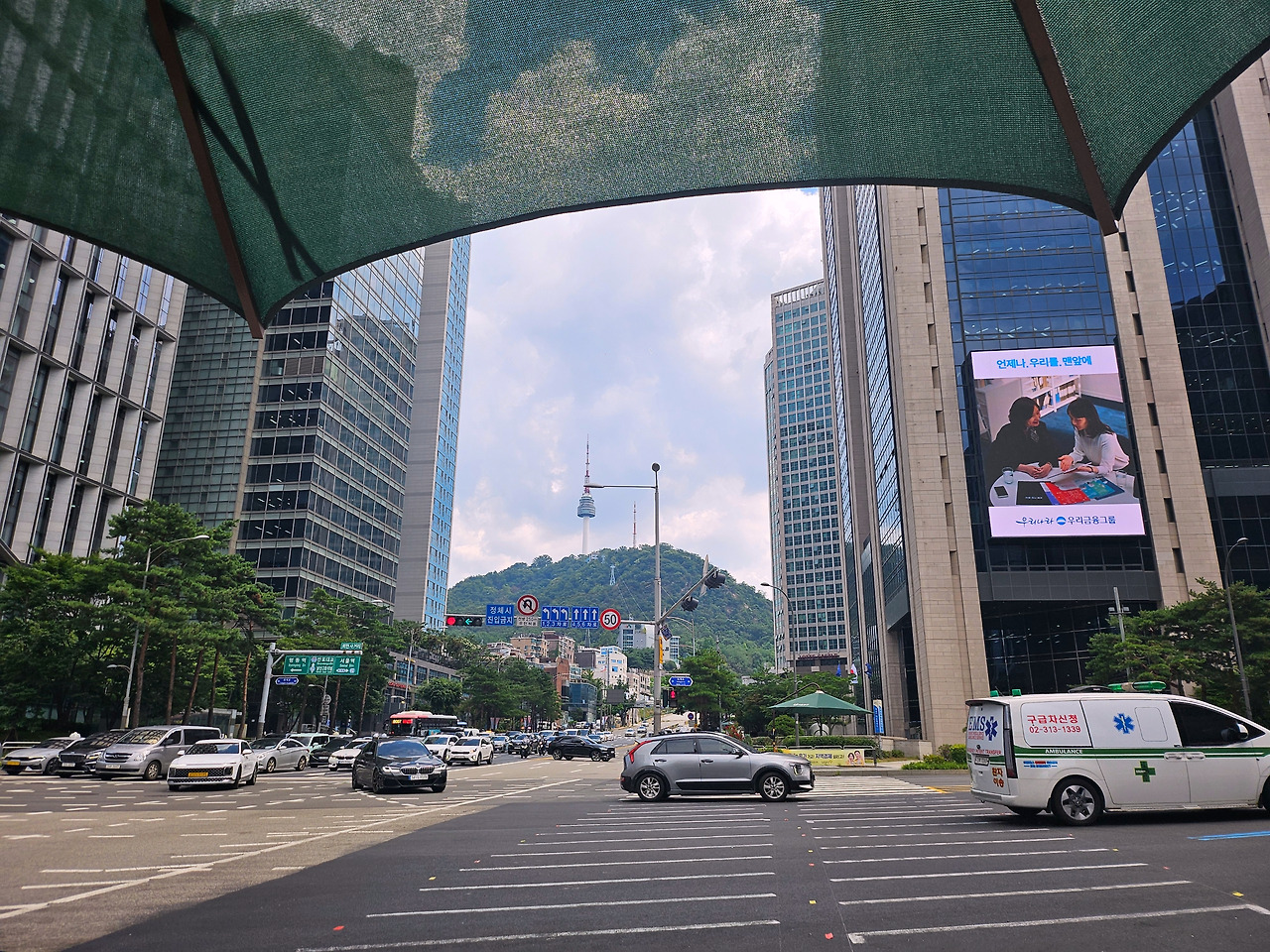 파라솔 아래에서 남산 타워 방면을 보며 한 장 찰칵.