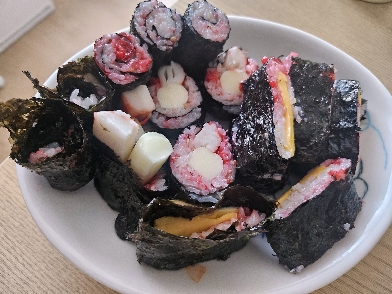 냉장고를 열고 김밥에 넣을 만한 것을 잠깐 고민하다가 우메보시와 스트링 치즈, 아직까지 생존해 있던 슬라이스 치즈 어르신 두 장, 그리고 크래미를 꺼냈다.