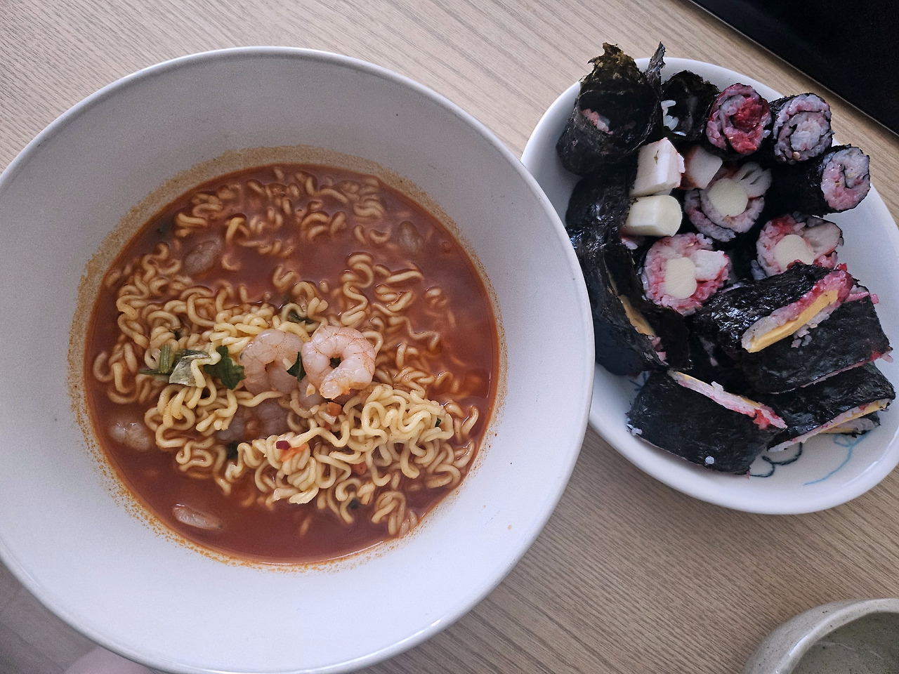 손으로 투박하게 둘둘 말아서 김밥의 형상을 갖춰낸 후, 라면에 새우를 넣고 하나 호르륵 끓여낸 후 식사를 하였다.