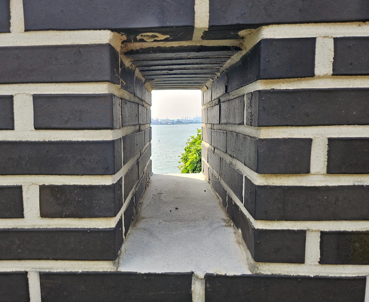 산책 중 네모난 구멍 사이로 보이는 바다도 한 번 좋아하며 찍어 보기.