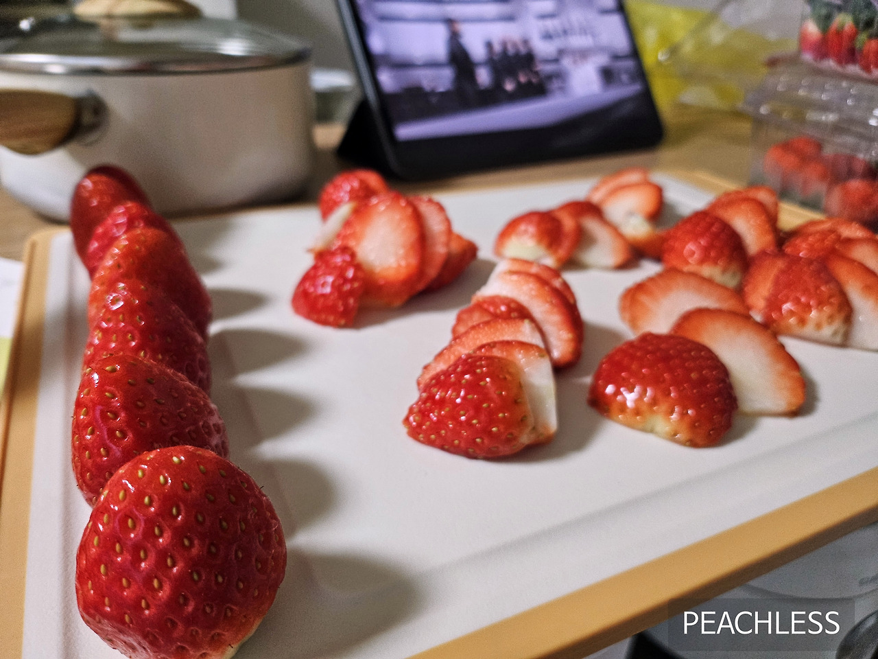 점심을 먹고 설거지를 한 후, 미리 끓여서 식혀둔 시럽을 준비하고 딸기를 슬라이스 하기 시작했다.