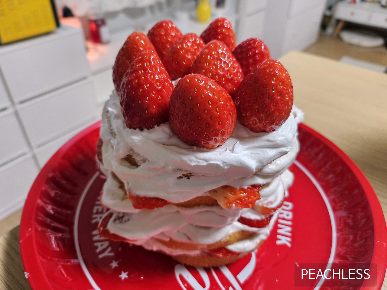 띠지가 없어서 딸기들이 탈출하고 난리인, 정말 치명적으로 못생긴 딸기 생크림 케이크가 완성되었다.