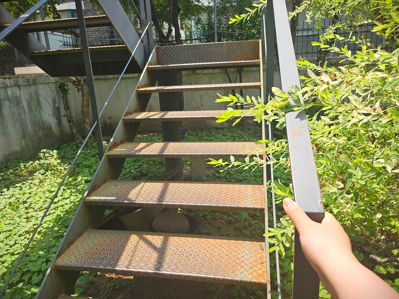 친절히 난간이 있지만, 얇은 철제 계단. 심지어 사이가 뚫려 있다.