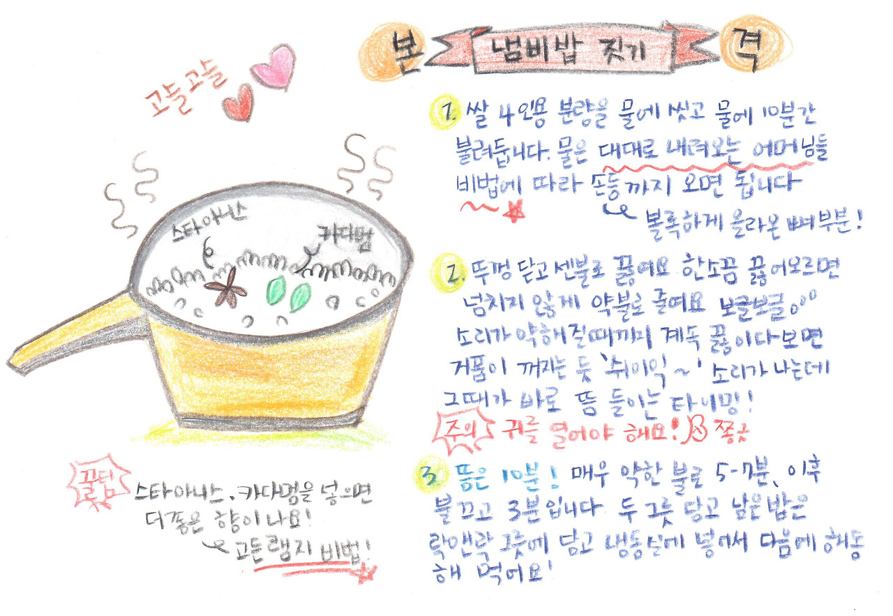 파스타 성공 후 그는 냄비밥에 도전했다. 압력밥솥의 찰진 밥보다 고슬고슬한 밥이 훨씬 맛있다는 게 그의 취향이다. 어머니께 비법도 전수받았다. "살짝 탄 냄새가 나면 뜸 들이기를 멈춰야 한다." 하지만 남편에겐 어머님 레시피가 잘 맞지 않았다. 우리 집 냄비 문제인건지 이상하게 탄 냄새가 안 난다는 것이다. 계속 냄비 앞에서 킁킁 거리던 남편은 결국 자기만의 방법을 찾아냈다. 냄새가 아닌 정확한 시간으로 뜸 시간을 알아낸 것. 보글보글 끓던 밥이 거품이 빠지는 거 같은 소리를 내는 시점이 있다. 장작에서 불 꺼지는 거 같은 자글자글 쉬이익~(의성어의 한계입니다)하는 소리인데 그 시점에서 뜸 들이기를 시작, 딱 10분(아주 약한 불에 7분, 불 끄고 3분) 뜸을 들이면 윤기가 좔좔 흐르는 고슬고슬한 냄비밥에 성공할 수 있다.
