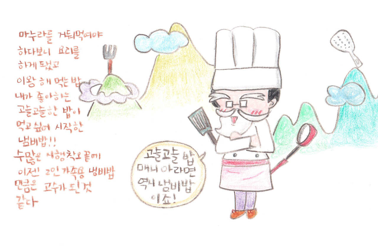 남편은 우리 집 요리사다. 내가 어설프게 칼질하는 걸 보더니 위험해 보인다며 내 칼을 빼앗던 그때부터였을까? 아니면 더 거슬러 올라가 결혼 전 존득존득한 마카롱을 만들어 보겠다면서 매일매일 집에서 머랭을 치던 그때부터였을까? 그의 말에 따르면 그가 본격적으로 요리라는 걸 하게 된 것은 김풍 밥 때문이란다. 그 요리라면 나도 먹어봤다. 지난 여름휴가 때 남편이 해줬다. '냉장고를 부탁해'에 나왔던 김풍의 '섹시한 컵'이라는 요리인데, 스팸과 바질페스토가 합쳐진 이상한 조합인데 희한하게 맛있어서 계속 퍼먹었던 그 음식. 그는 김풍밥을 만들면서 이 음식이야말로 자신의 요리 정신에 부합한다는 것을 깨달았다고 한다. 그 요리 정신이라는 건 다름 아닌 "불량한 초딩맛"이다. 그러니 우리 부부가 살이 찔 수밖에 없는 이유가 분명해졌다.
