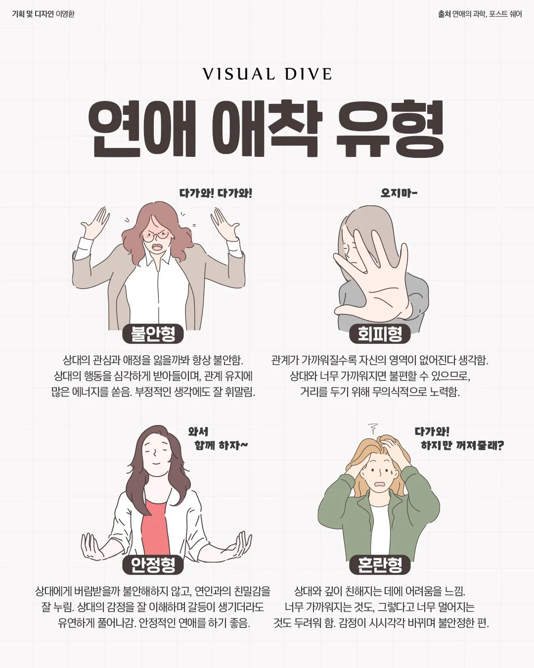 우리가 아주아주 어렸을 때, 그러니까 세상에 태어난 직후부터 양육자와 애착을 형성하고 이를 강화하면서 개인의 애착 유형이 결정된다. 이는 훗날 타인과의 정서적 관계를 맺을 때 발현되는 성인의 애착 유형에 까지 영향을 미치게 된다. 주로 낭만적 관계에서 드러나는 성인의 애착 유형은 불안형, 회피형, 안정형, 혼란형 등 4가지로 분류된다. 이 중에서도 자석의 N극과 S극과도 같은 불안형과 회피형은 두 사람의 서로 다른 모습에서 자신의 견해를 더욱 공고히 하며 빠르게 가까워지기도 하지만, 위기의 순간을 맞닥뜨렸을 때 정반대의 해결 방법으로 갈등하다 이별까지 이어지는 경우가 대부분이다.