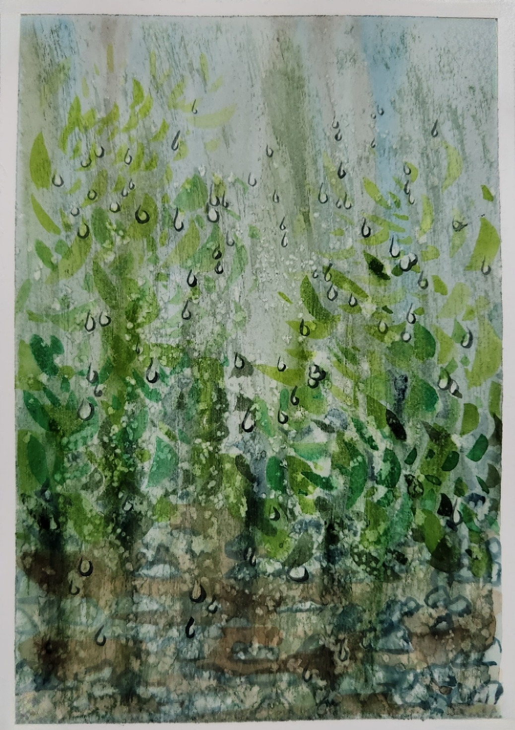 도서관 가는 길은 초록의 향연이 펼쳐진다. 다양한 초록을 붓을 이리저리 돌려 가며 표현한다. 내 눈에 보인 수많은 초록을 어떻게 작은 종이에 옮길 수 있을까. 도서관 가는 길에 만났던 고양이와 조용한 응시를 통한 말없는 대치에서 느껴진 친근함, 며칠 뒤 다시 마주한 전체적으로 까맣고 눈주위만 하얗던 고양이는 나를 알아보았을까. 초록의 향연에 돌을 이리저리 배치한 이유는 무엇일까. 1월 어느 날 부산의 한 해변가에서 보았던 여기저기 세워놓은 돌탑을 흩어놓은 것일까. 돌 하나하나에 담긴 소망을 내가 가는 길 위에 옮겨놓은 것일까. 내가 바라는 것들이 나를 외면할 때 막연히 노력이 부족해서, 정성이 부족해서라고 말할 수 있을까. 삶의 편의를 위해서 방향을 전환하는 것이 맞을까. 그저 흘러가는 시간에 맡기고 오늘 떠오른 것들을 하는 것이 맞을까. 이리저리 다른 시도를 하는 것이 맞을까. 이런저런 생각들이 소망이 담긴 저 돌들 하나하나에 담겨있는 것은 아닐까.