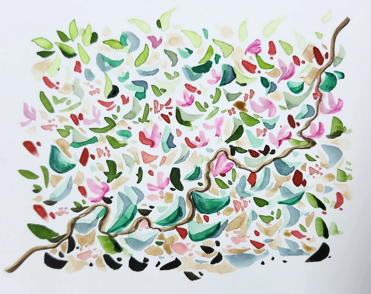 만발했던 벚꽃이 거센 비바람에 순식간에 자취를 감추고 도처에 새로운 꽃이 피어있다. 꽃이름은 너무 어렵다. 암기는 가볍게 포기. 이름을 알 수 없는 꽃과 햇빛을 본 기간에 따라, 색이 달라진 나뭇잎의 초록빛 향연이 표현의 욕구를 상승시킨다. 팔레트에 있는 초록빛을 순서대로 찍어 도화지에 다른 모양으로 찍듯이 표현한다. 둥근 붓, 사선붓, 납작붓을 이용해 이리저리 방향을 바꾸어가며 그린다. 실제로 같은 색, 같은 모양, 같은 크기의 나뭇잎은 없으므로…. 떨어진 꽃잎, 가지에 붙어있는 이러저러한 꽃도 나름의 방식으로 표현한다. 꽃이름을 알 수 없기에 그저 꽃 같으면 된다는 편안한 마음으로 붓 끝을 이용해 내 상상 속의 꽃을 색으로 형태로 펼쳐나간다.