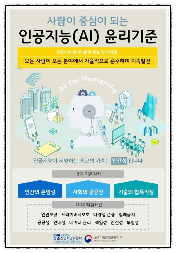 한국의 경우 2020년 6월, 「국가정보화 기본법」을 「지능정보화 기본법」으로 전면 개편하면서 인공지능 생태계를 구축의 법적 기반을 마련하였으며, 2020년 12월 학기술정보통신부와 정보통신정책연구원의 「사람이 중심이 되는 인공지능 윤리기준(‘20.12)」 발표를 통해 사회구성원이 인공지능 개발·활용 전 단계에서 함께 지켜야 할 주요 원칙과 핵심 요건을 제시하였습니다.