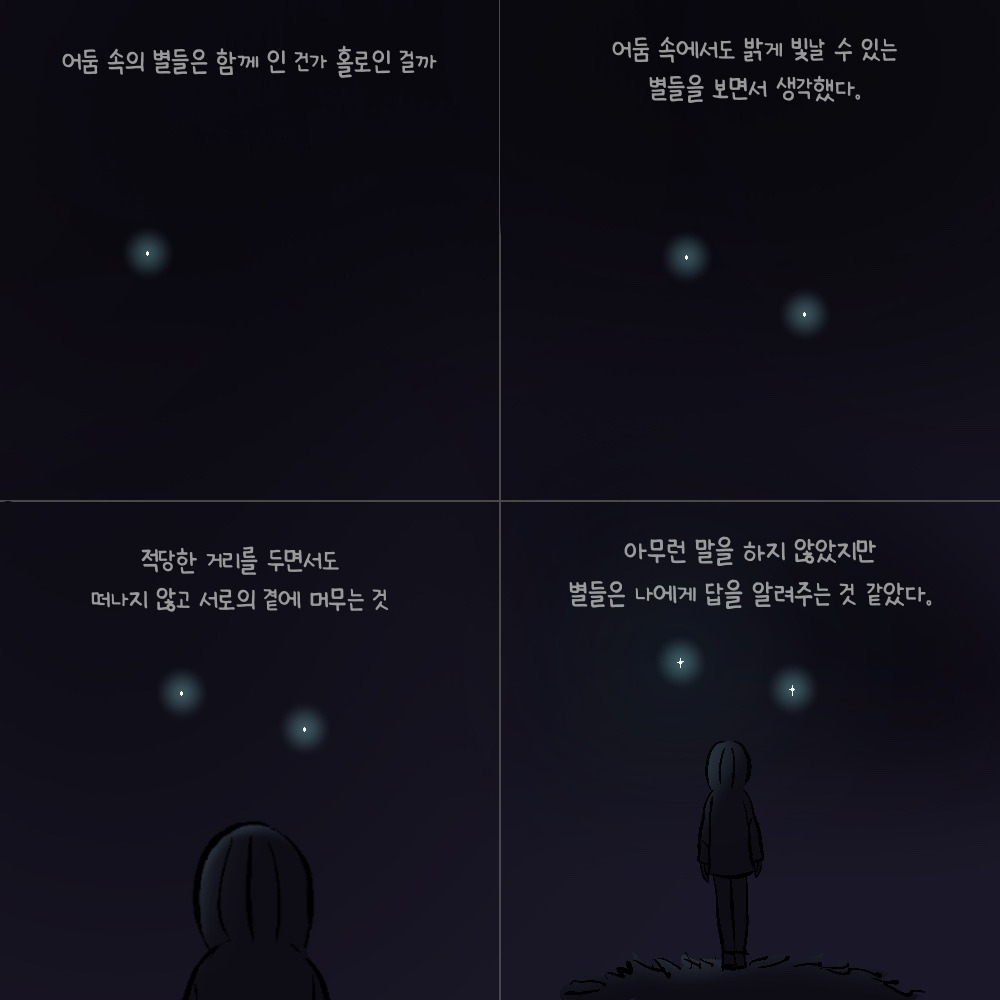 어둠 속에 혼자서도 빛나는 별이 강해 보였다. 하지만 적당한 거리에 또 다른 별이 있었다. 어둠 속에서도 빛나는 별이 되고싶다. 그리고 적당한 거리를 두며 결코 떠나지 않는 별이 되고 싶다.