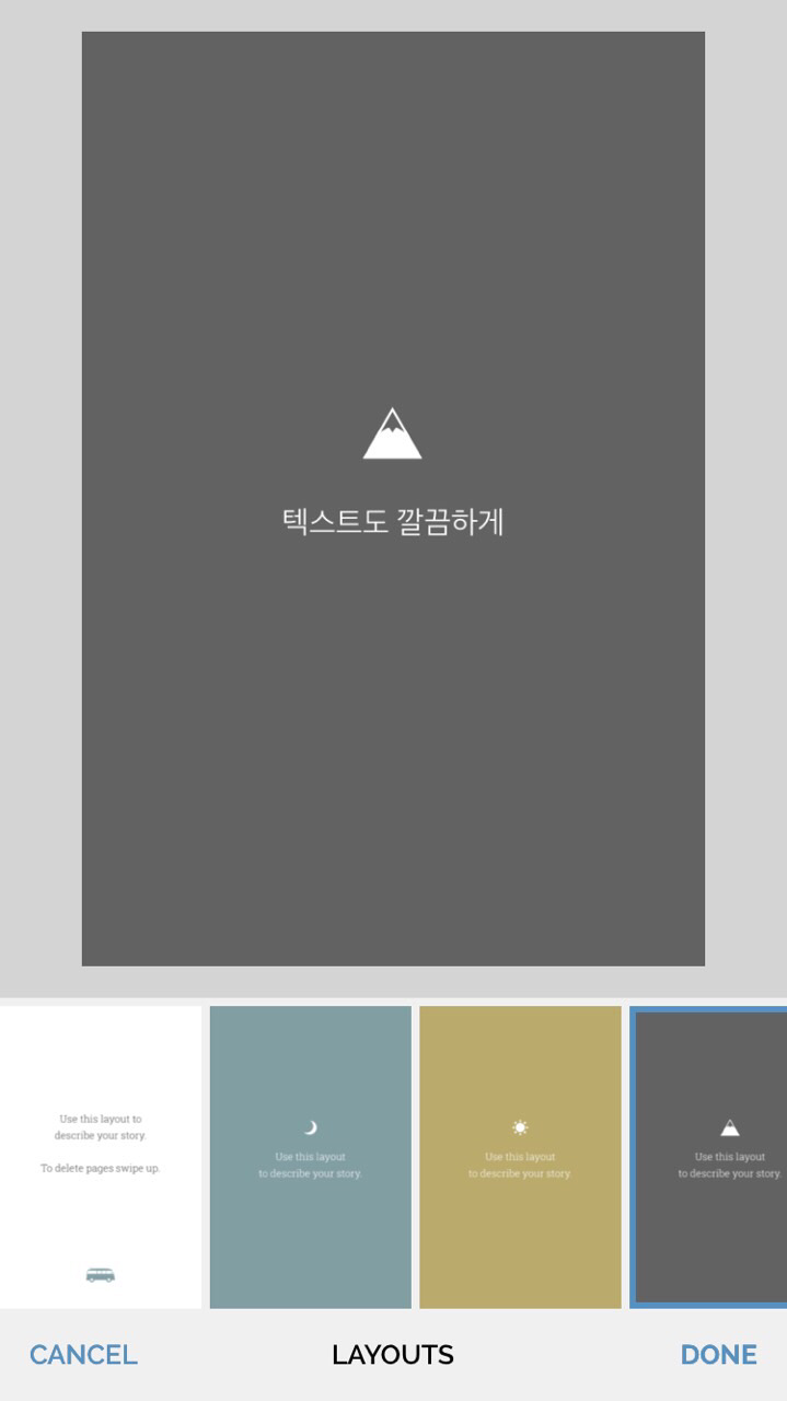 특정 테마를 선택한 후 작성하더라도 작성하는 글의 구성에 따라 페이지의 레이아웃은 자유롭게 수정/변경이 가능하다. 또한 이미지에 최적화되어 있긴 하지만 텍스트만 작성하더라도 전체적인 느낌을 해하지 않도록 깔끔하고 아름다운 레이아웃을 제공한다.