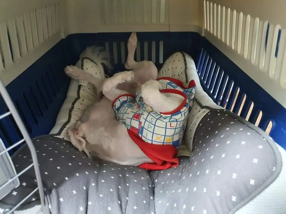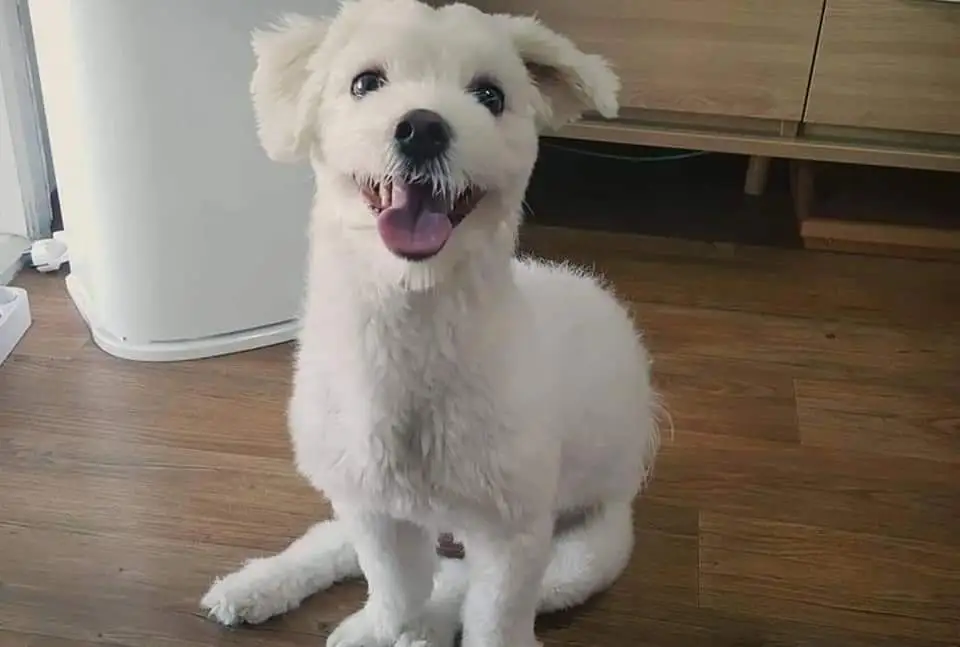 바구니 안에는 푹신한 이불 한 채가 깔려있었고, 바로 거기에 작고 하얀 강아지 한 마리가 앉아있었다.