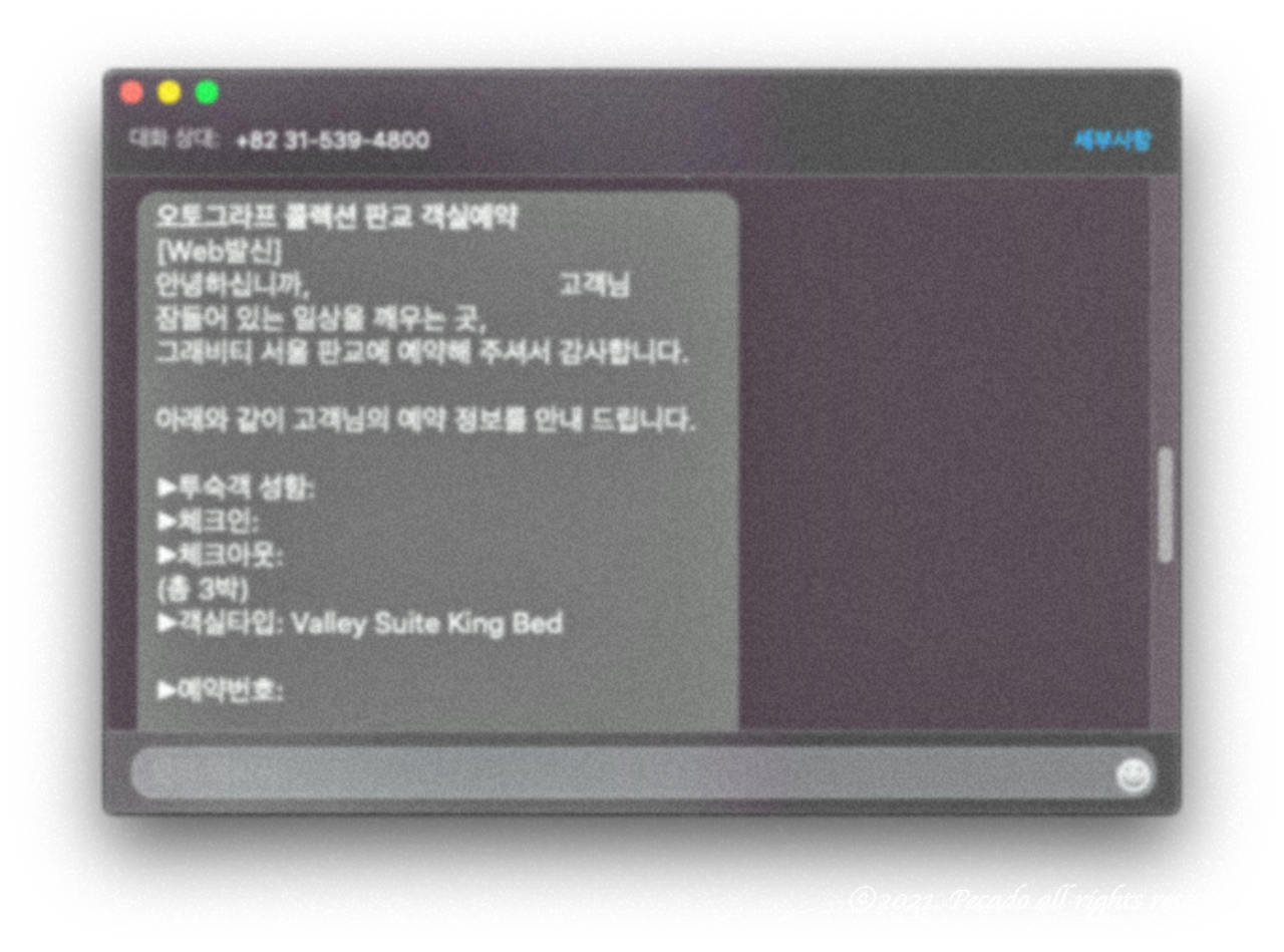 우선 나에게 배정된 객실 타입과 투숙 기간에 대한 안내를 시작으로, 내 회원정보 중에서 전화번호와 이메일주소의 변동여부, 레이트 체크아웃의 필요여부를 묻는다. 끝으로 금연 등 객실 내 금지사항 및 주의사항에 대한 안내와 그에 대한 동의서에 자필 서명을 요구한다. 그럼 나는 늘 '감사 :)'라고 서명을 한다.