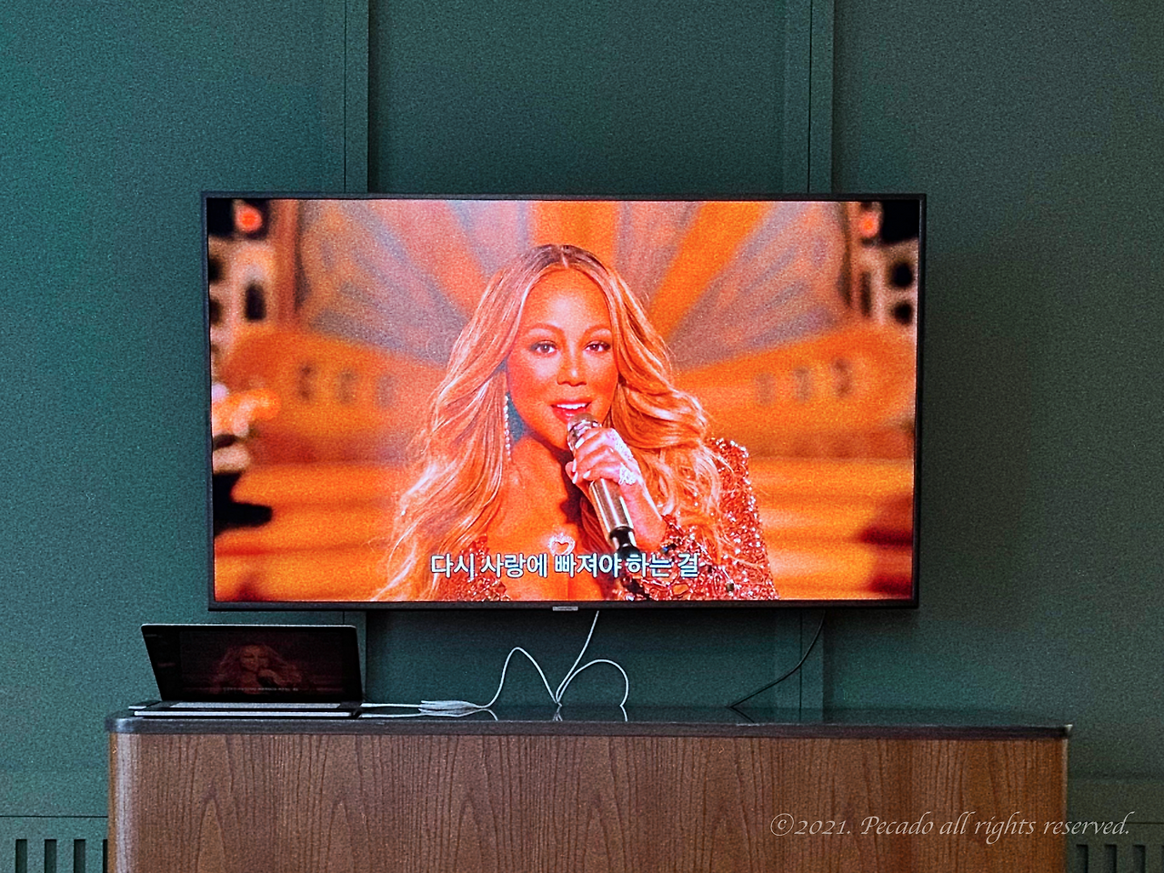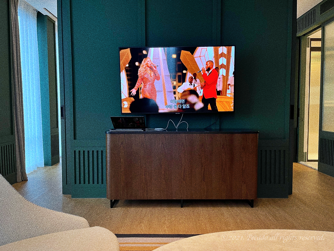 직원 분께서 내 서명을 보시더니 빙그레 미소를 지으며 천천히 문을 닫고 나가셨다. 그 즉시 리모컨으로 텔레비전의 볼륨을 높이고 음악을 재생했다.