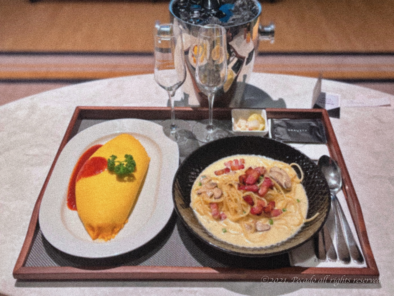엄청난 사이즈의 정통 일본식 오므라이스를 호텔에서 맛볼 수 있다는 기쁨과 동시에, 이게 삼겹살인지 베이컨인지 알 수 없을 정도로 큼직하게 썰린 통 베이컨이 듬뿍 담긴 까르보나라는 계속 당기는 맛이라 샴페인과 궁합이 좋았다.