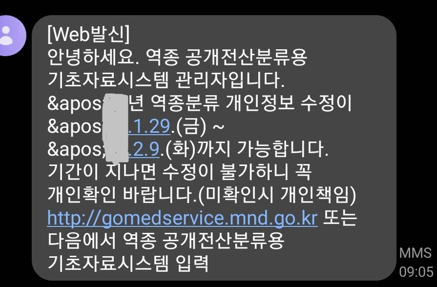 이 분류를 위한 기본적인 개인정보들을 잘 입력해도라는 경고 문자가 날아오게 된다.
